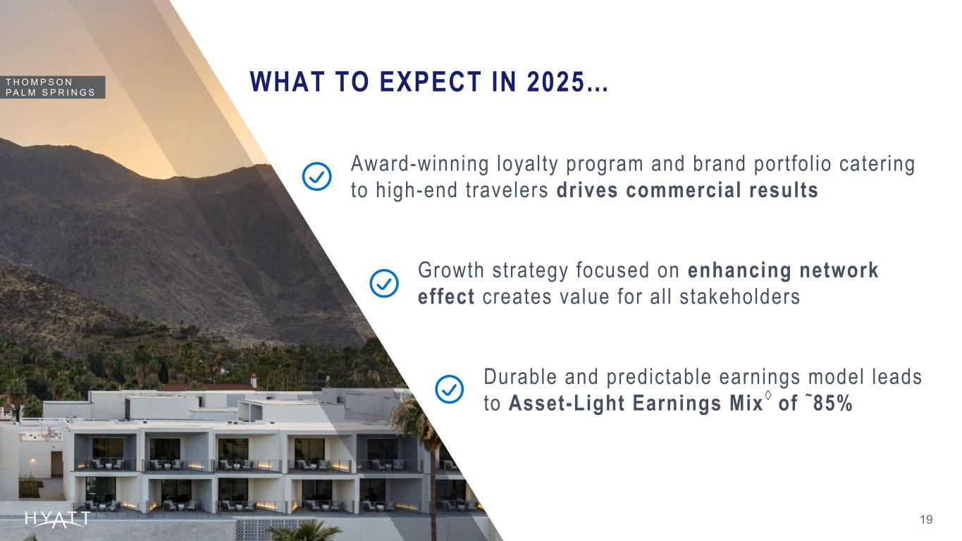 WHAT TO EXPECT IN 2025…T H O M P S O N P A L M S P R I N G S Growth strategy focused on enhancing network effect creates value for al l stakeholders Durable and predictable earnings model leads to Asset-Light Earnings Mix◊ of ~85% Award-winning loyalty program and brand portfol io catering to high-end travelers drives commercial results 19 Footnotes: The Company’s outlook is based on a number of assumptions that are subject to change and many of which are outside the control of the Company. If actual results vary from these assumptions, the Company's expectations may change. There can be no assurance that the Company will achieve these results.