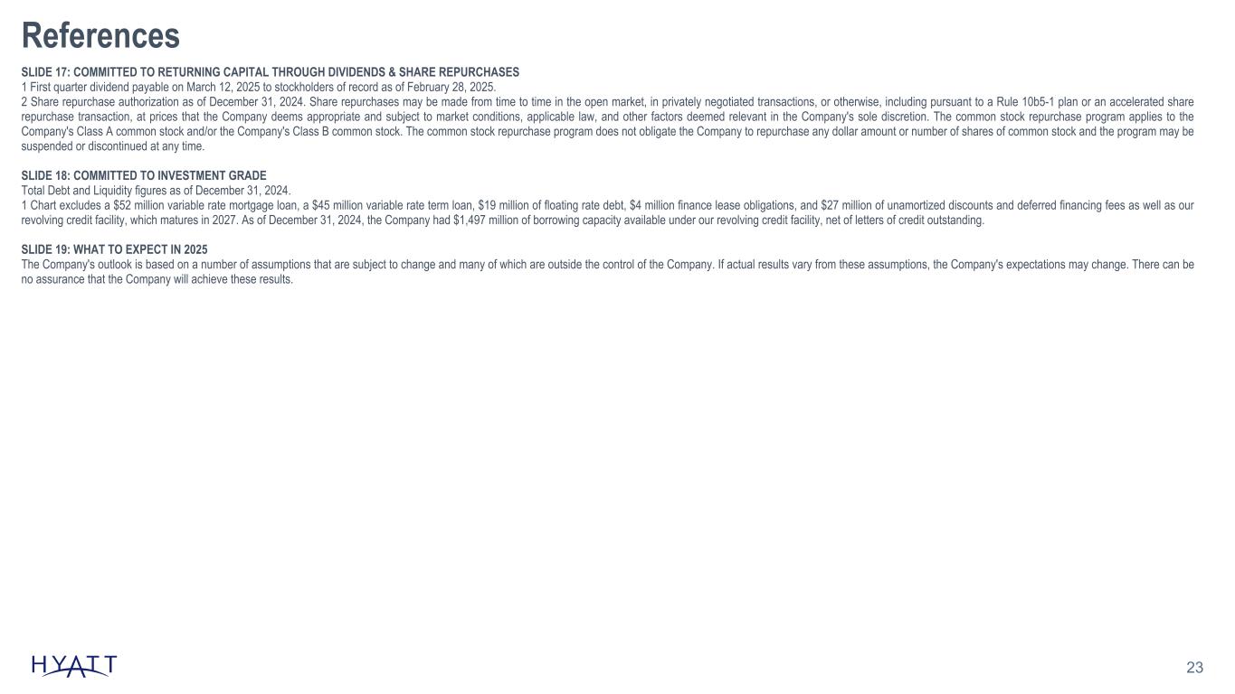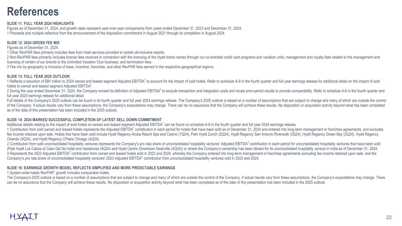 22 References SLIDE 11: FULL YEAR 2024 HIGHLIGHTS Figures as of December 31, 2024, and growth rates represent year-over-year comparisons from years ended December 31, 2023 and December 31, 2024. 1 Proceeds and multiple reflective from the announcement of the disposition commitment in August 2021 through its completion in August 2024. SLIDE 12: 2024 GROSS FEE MIX Figures as of December 31, 2024. 1 Other RevPAR fees primarily includes fees from hotel services provided to certain all-inclusive resorts. 2 Non-RevPAR fees primarily includes license fees received in connection with the licensing of the Hyatt brand names through our co-branded credit card programs and vacation units; management and royalty fees related to the management and licensing of certain of our brands to the Unlimited Vacation Club business; and termination fees. 3 Fee mix by geography is inclusive of base, incentive, franchise, and other RevPAR fees earned in the respective geographical regions. SLIDE 13: FULL YEAR 2025 OUTLOOK 1 Reflects a reduction of $80 million to 2024 owned and leased segment Adjusted EBITDA† to account for the impact of sold hotels. Refer to schedule A-9 in the fourth quarter and full year earnings release for additional detail on the impact of sold hotels to owned and leased segment Adjusted EBITDA†. 2 During the year ended December 31, 2024, the Company revised its definition of Adjusted EBITDA† to exclude transaction and integration costs and recast prior-period results to provide comparability. Refer to schedule A-6 in the fourth quarter and full year 2024 earnings release for additional detail. Full details of the Company's 2025 outlook can be found in its fourth quarter and full year 2024 earnings release. The Company's 2025 outlook is based on a number of assumptions that are subject to change and many of which are outside the control of the Company. If actual results vary from these assumptions, the Company's expectations may change. There can be no assurance that the Company will achieve these results. No disposition or acquisition activity beyond what has been completed as of the date of this presentation has been included in the 2025 outlook. SLIDE 14: 2024 MARKED SUCCESSFUL COMPLETION OF LATEST SELL DOWN COMMITMENT Additional details relating to the impact of sold hotels on owned and leased segment Adjusted EBITDA† can be found on schedule A-9 in the fourth quarter and full year 2024 earnings release. 1 Contribution from sold owned and leased hotels represents the Adjusted EBITDA† contribution in each period for hotels that have been sold as of December 31, 2024 and entered into long-term management or franchise agreements, and excludes fee income retained upon sale. Hotels that have been sold include Hyatt Regency Aruba Resort Spa and Casino (1Q24), Park Hyatt Zurich (2Q24), Hyatt Regency San Antonio Riverwalk (2Q24), Hyatt Regency Green Bay (2Q24), Hyatt Regency Orlando (3Q24), and Hyatt Regency O'Hare Chicago (4Q24). 2 Contribution from sold unconsolidated hospitality ventures represents the Company's pro rata share of unconsolidated hospitality ventures' Adjusted EBITDA† contribution in each period for unconsolidated hospitality ventures that have been sold (Park Hyatt Los Cabos at Cabo Del Sol hotel and residences (4Q24) and Hyatt Centric Downtown Nashville (4Q24)) or where the Company's ownership has been diluted for its unconsolidated hospitality venture in India as of December 31, 2024. 3 Represents the 2023 Adjusted EBITDA† contribution from owned and leased hotels sold in 2023 and 2024, whereby the Company entered into long-term management or franchise agreements excluding fee income retained upon sale, and the Company's pro rata share of unconsolidated hospitality ventures' 2023 Adjusted EBITDA† contribution from unconsolidated hospitality ventures sold in 2023 and 2024. SLIDE 16: EARNINGS GROWTH MODEL REFLECTS SIMPLIFIED AND MORE PREDICTABLE EARNINGS 1 System-wide hotels RevPAR◊ growth includes comparable hotels. The Company's 2025 outlook is based on a number of assumptions that are subject to change and many of which are outside the control of the Company. If actual results vary from these assumptions, the Company's expectations may change. There can be no assurance that the Company will achieve these results. No disposition or acquisition activity beyond what has been completed as of the date of this presentation has been included in the 2025 outlook.