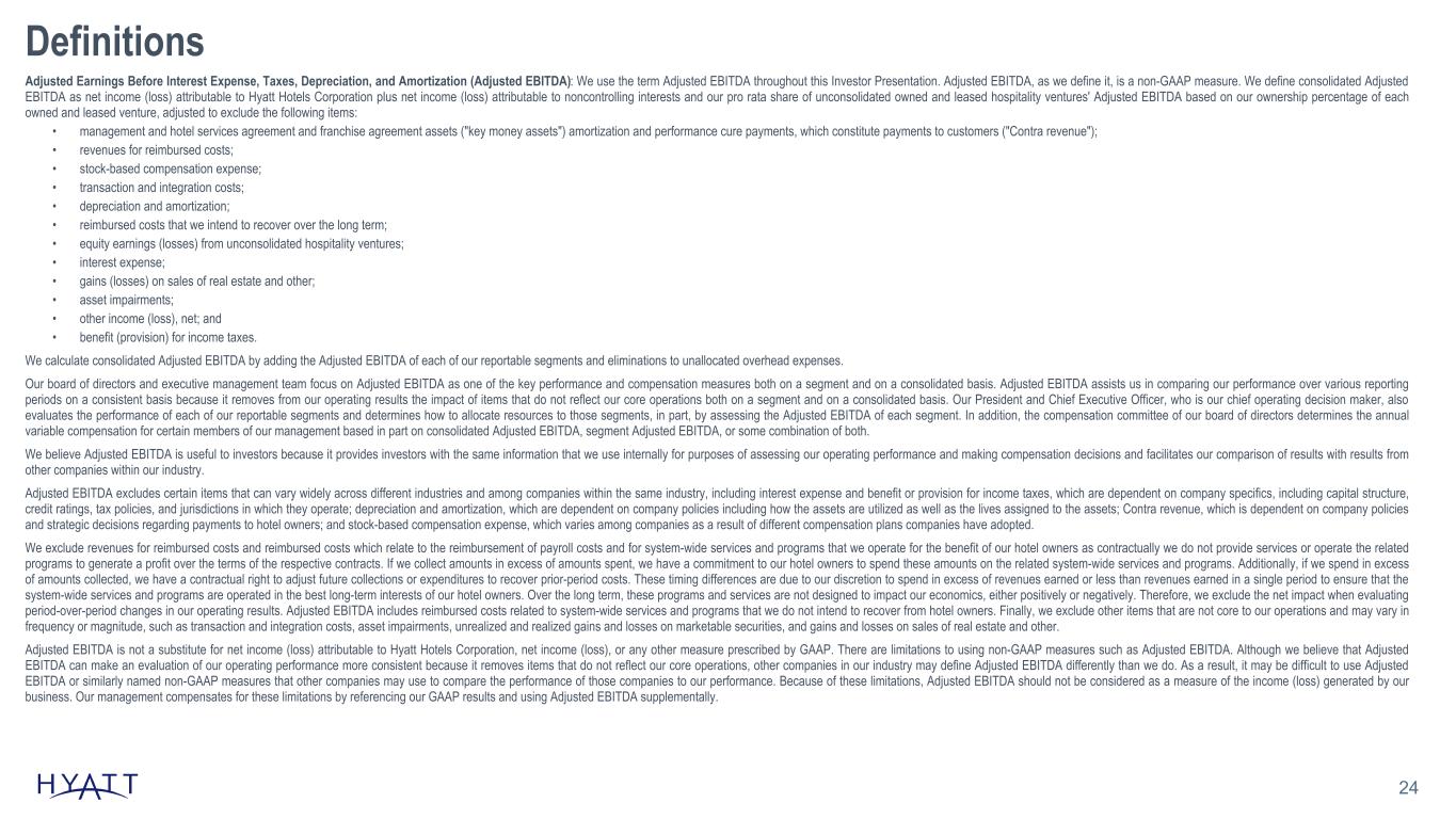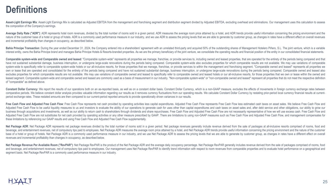 24 Definitions Adjusted Earnings Before Interest Expense, Taxes, Depreciation, and Amortization (Adjusted EBITDA): We use the term Adjusted EBITDA throughout this Investor Presentation. Adjusted EBITDA, as we define it, is a non-GAAP measure. We define consolidated Adjusted EBITDA as net income (loss) attributable to Hyatt Hotels Corporation plus net income (loss) attributable to noncontrolling interests and our pro rata share of unconsolidated owned and leased hospitality ventures' Adjusted EBITDA based on our ownership percentage of each owned and leased venture, adjusted to exclude the following items: • management and hotel services agreement and franchise agreement assets ("key money assets") amortization and performance cure payments, which constitute payments to customers ("Contra revenue"); • revenues for reimbursed costs; • stock-based compensation expense; • transaction and integration costs; • depreciation and amortization; • reimbursed costs that we intend to recover over the long term; • equity earnings (losses) from unconsolidated hospitality ventures; • interest expense; • gains (losses) on sales of real estate and other; • asset impairments; • other income (loss), net; and • benefit (provision) for income taxes. We calculate consolidated Adjusted EBITDA by adding the Adjusted EBITDA of each of our reportable segments and eliminations to unallocated overhead expenses. Our board of directors and executive management team focus on Adjusted EBITDA as one of the key performance and compensation measures both on a segment and on a consolidated basis. Adjusted EBITDA assists us in comparing our performance over various reporting periods on a consistent basis because it removes from our operating results the impact of items that do not reflect our core operations both on a segment and on a consolidated basis. Our President and Chief Executive Officer, who is our chief operating decision maker, also evaluates the performance of each of our reportable segments and determines how to allocate resources to those segments, in part, by assessing the Adjusted EBITDA of each segment. In addition, the compensation committee of our board of directors determines the annual variable compensation for certain members of our management based in part on consolidated Adjusted EBITDA, segment Adjusted EBITDA, or some combination of both. We believe Adjusted EBITDA is useful to investors because it provides investors with the same information that we use internally for purposes of assessing our operating performance and making compensation decisions and facilitates our comparison of results with results from other companies within our industry. Adjusted EBITDA excludes certain items that can vary widely across different industries and among companies within the same industry, including interest expense and benefit or provision for income taxes, which are dependent on company specifics, including capital structure, credit ratings, tax policies, and jurisdictions in which they operate; depreciation and amortization, which are dependent on company policies including how the assets are utilized as well as the lives assigned to the assets; Contra revenue, which is dependent on company policies and strategic decisions regarding payments to hotel owners; and stock-based compensation expense, which varies among companies as a result of different compensation plans companies have adopted. We exclude revenues for reimbursed costs and reimbursed costs which relate to the reimbursement of payroll costs and for system-wide services and programs that we operate for the benefit of our hotel owners as contractually we do not provide services or operate the related programs to generate a profit over the terms of the respective contracts. If we collect amounts in excess of amounts spent, we have a commitment to our hotel owners to spend these amounts on the related system-wide services and programs. Additionally, if we spend in excess of amounts collected, we have a contractual right to adjust future collections or expenditures to recover prior-period costs. These timing differences are due to our discretion to spend in excess of revenues earned or less than revenues earned in a single period to ensure that the system-wide services and programs are operated in the best long-term interests of our hotel owners. Over the long term, these programs and services are not designed to impact our economics, either positively or negatively. Therefore, we exclude the net impact when evaluating period-over-period changes in our operating results. Adjusted EBITDA includes reimbursed costs related to system-wide services and programs that we do not intend to recover from hotel owners. Finally, we exclude other items that are not core to our operations and may vary in frequency or magnitude, such as transaction and integration costs, asset impairments, unrealized and realized gains and losses on marketable securities, and gains and losses on sales of real estate and other. Adjusted EBITDA is not a substitute for net income (loss) attributable to Hyatt Hotels Corporation, net income (loss), or any other measure prescribed by GAAP. There are limitations to using non-GAAP measures such as Adjusted EBITDA. Although we believe that Adjusted EBITDA can make an evaluation of our operating performance more consistent because it removes items that do not reflect our core operations, other companies in our industry may define Adjusted EBITDA differently than we do. As a result, it may be difficult to use Adjusted EBITDA or similarly named non-GAAP measures that other companies may use to compare the performance of those companies to our performance. Because of these limitations, Adjusted EBITDA should not be considered as a measure of the income (loss) generated by our business. Our management compensates for these limitations by referencing our GAAP results and using Adjusted EBITDA supplementally.