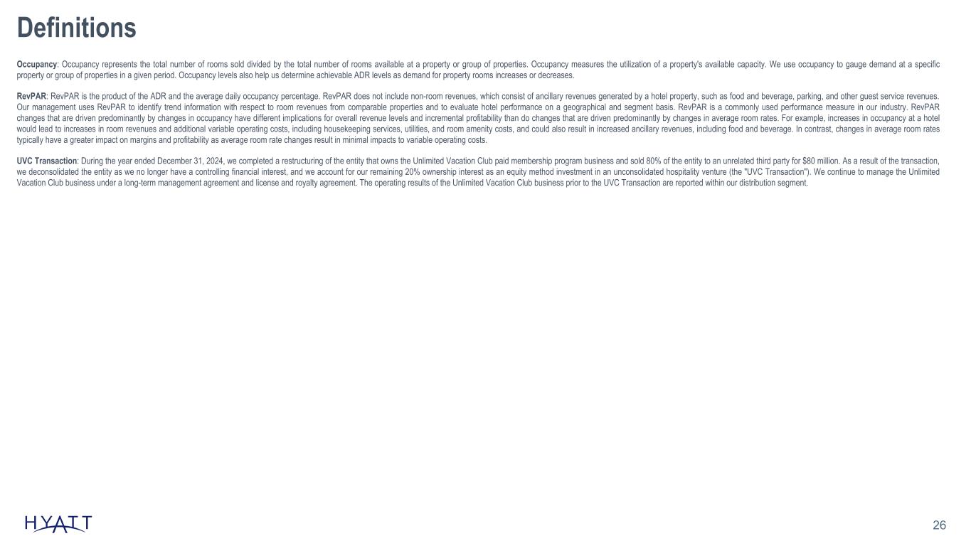 26 Definitions Occupancy: Occupancy represents the total number of rooms sold divided by the total number of rooms available at a property or group of properties. Occupancy measures the utilization of a property's available capacity. We use occupancy to gauge demand at a specific property or group of properties in a given period. Occupancy levels also help us determine achievable ADR levels as demand for property rooms increases or decreases. RevPAR: RevPAR is the product of the ADR and the average daily occupancy percentage. RevPAR does not include non-room revenues, which consist of ancillary revenues generated by a hotel property, such as food and beverage, parking, and other guest service revenues. Our management uses RevPAR to identify trend information with respect to room revenues from comparable properties and to evaluate hotel performance on a geographical and segment basis. RevPAR is a commonly used performance measure in our industry. RevPAR changes that are driven predominantly by changes in occupancy have different implications for overall revenue levels and incremental profitability than do changes that are driven predominantly by changes in average room rates. For example, increases in occupancy at a hotel would lead to increases in room revenues and additional variable operating costs, including housekeeping services, utilities, and room amenity costs, and could also result in increased ancillary revenues, including food and beverage. In contrast, changes in average room rates typically have a greater impact on margins and profitability as average room rate changes result in minimal impacts to variable operating costs. UVC Transaction: During the year ended December 31, 2024, we completed a restructuring of the entity that owns the Unlimited Vacation Club paid membership program business and sold 80% of the entity to an unrelated third party for $80 million. As a result of the transaction, we deconsolidated the entity as we no longer have a controlling financial interest, and we account for our remaining 20% ownership interest as an equity method investment in an unconsolidated hospitality venture (the "UVC Transaction"). We continue to manage the Unlimited Vacation Club business under a long-term management agreement and license and royalty agreement. The operating results of the Unlimited Vacation Club business prior to the UVC Transaction are reported within our distribution segment.