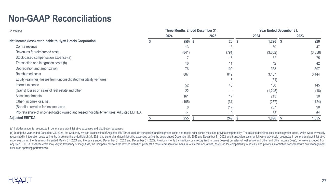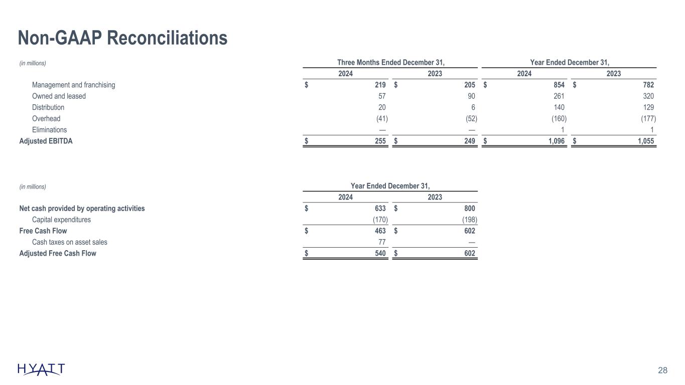 Non-GAAP Reconciliations 27 (in millions) Three Months Ended December 31, Year Ended December 31, 2024 2023 2024 2023 Net income (loss) attributable to Hyatt Hotels Corporation $ (56) $ 26 $ 1,296 $ 220 Contra revenue 13 13 69 47 Revenues for reimbursed costs (841) (791) (3,352) (3,058) Stock-based compensation expense (a) 7 15 62 75 Transaction and integration costs (b) 16 11 42 42 Depreciation and amortization 76 100 333 397 Reimbursed costs 887 842 3,457 3,144 Equity (earnings) losses from unconsolidated hospitality ventures 1 5 (31) 1 Interest expense 52 40 180 145 (Gains) losses on sales of real estate and other 22 — (1,245) (18) Asset impairments 161 17 213 30 Other (income) loss, net (105) (31) (257) (124) (Benefit) provision for income taxes 8 (17) 267 90 Pro rata share of unconsolidated owned and leased hospitality ventures' Adjusted EBITDA 14 19 62 64 Adjusted EBITDA $ 255 $ 249 $ 1,096 $ 1,055 Source Notes: linked to ER schedule (a) Includes amounts recognized in general and administrative expenses and distribution expenses. (b) During the year ended December 31, 2024, the Company revised its definition of Adjusted EBITDA to exclude transaction and integration costs and recast prior-period results to provide comparability. The revised definition excludes integration costs, which were previously recognized in integration costs during the three months ended March 31, 2024 and general and administrative expenses during the years ended December 31, 2023 and December 31, 2022, and transaction costs, which were previously recognized in general and administrative expenses during the three months ended March 31, 2024 and the years ended December 31, 2023 and December 31, 2022. Previously, only transaction costs recognized in gains (losses) on sales of real estate and other and other income (loss), net were excluded from Adjusted EBITDA. As these costs may vary in frequency or magnitude, the Company believes the revised definition presents a more representative measure of its core operations, assists in the comparability of results, and provides information consistent with how management evaluates operating performance.