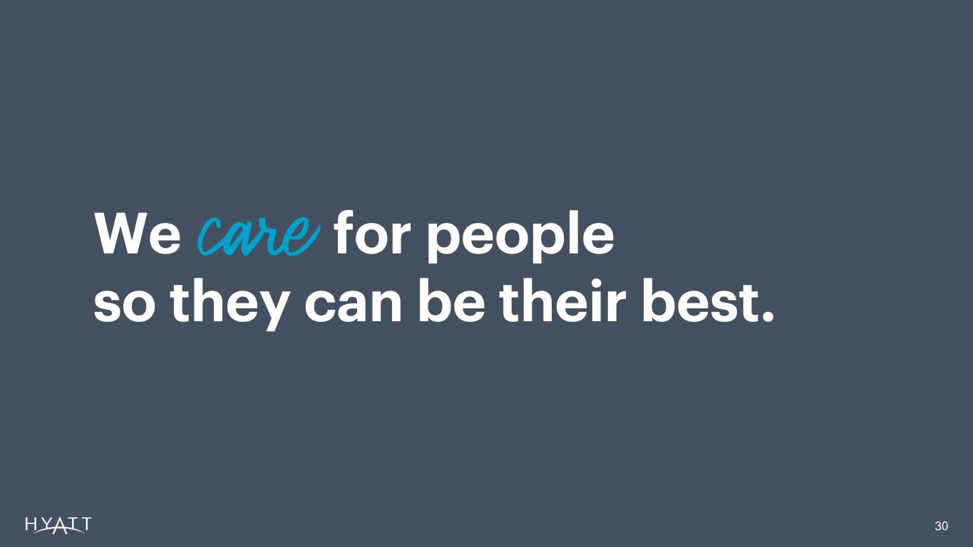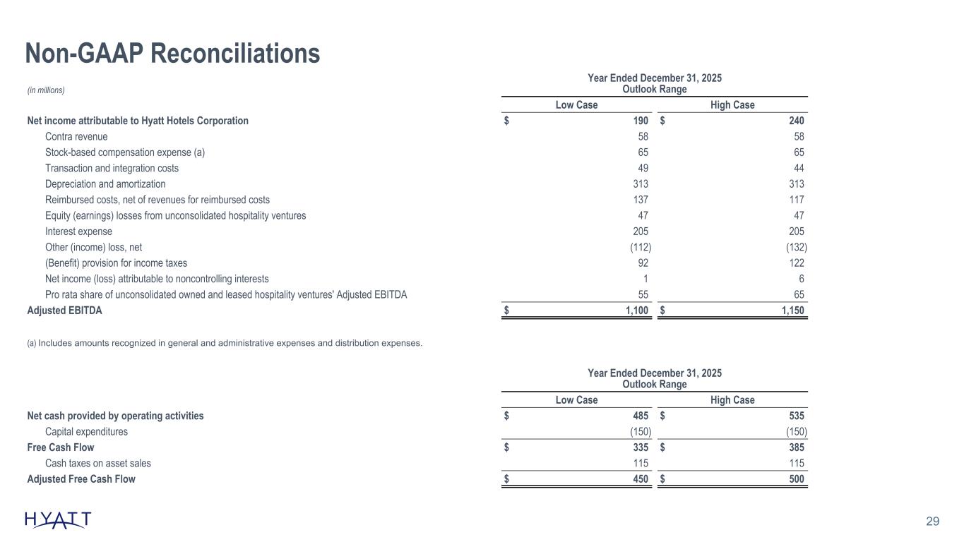 Non-GAAP Reconciliations 29 (in millions) Year Ended December 31, 2025 Outlook Range Low Case High Case Net income attributable to Hyatt Hotels Corporation $ 190 $ 240 Contra revenue 58 58 Stock-based compensation expense (a) 65 65 Transaction and integration costs 49 44 Depreciation and amortization 313 313 Reimbursed costs, net of revenues for reimbursed costs 137 117 Equity (earnings) losses from unconsolidated hospitality ventures 47 47 Interest expense 205 205 Other (income) loss, net (112) (132) (Benefit) provision for income taxes 92 122 Net income (loss) attributable to noncontrolling interests 1 6 Pro rata share of unconsolidated owned and leased hospitality ventures' Adjusted EBITDA 55 65 Adjusted EBITDA $ 1,100 $ 1,150 (a) Includes amounts recognized in general and administrative expenses and distribution expenses. Year Ended December 31, 2025 Outlook Range Low Case High Case Net cash provided by operating activities $ 485 $ 535 Capital expenditures (150) (150) Free Cash Flow $ 335 $ 385 Cash taxes on asset sales 115 115 Adjusted Free Cash Flow $ 450 $ 500 Source Notes: linked to ER schedule