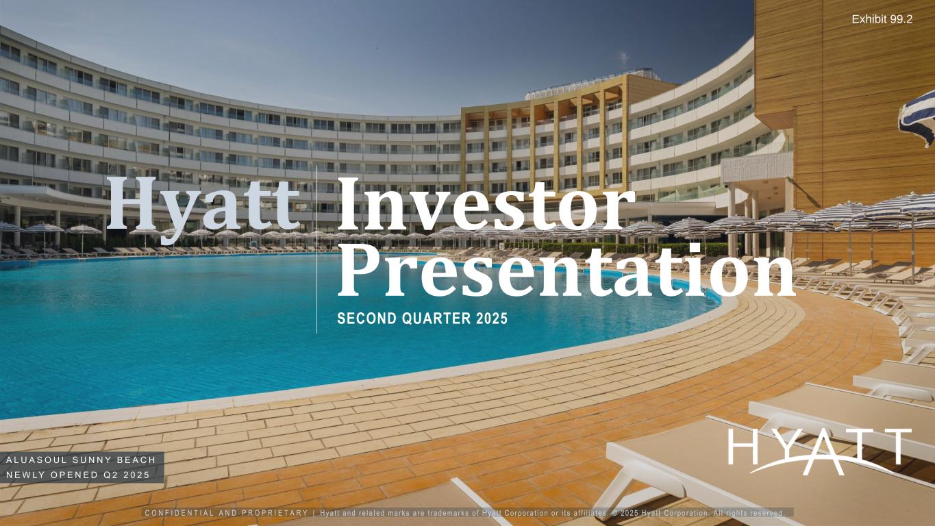 C O N F I D E N T I A L A N D P R O P R I E T A R Y | H y a t t a n d r e l a t e d m a r k s a r e t r a d e m a r k s o f H y a t t C o r p o r a t i o n o r i t s a f f i l i a t e s . © 2 0 2 5 H y a t t C o r p o r a t i o n . A l l r i g h t s r e s e r v e d . Investor Presentation Hyatt SECOND QUARTER 2025 A L U A S O U L S U N N Y B E A C H N E W L Y O P E N E D Q 2 2 0 2 5