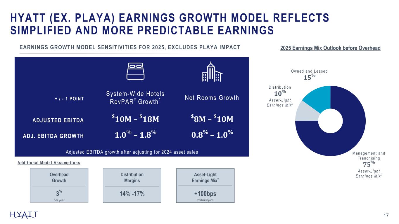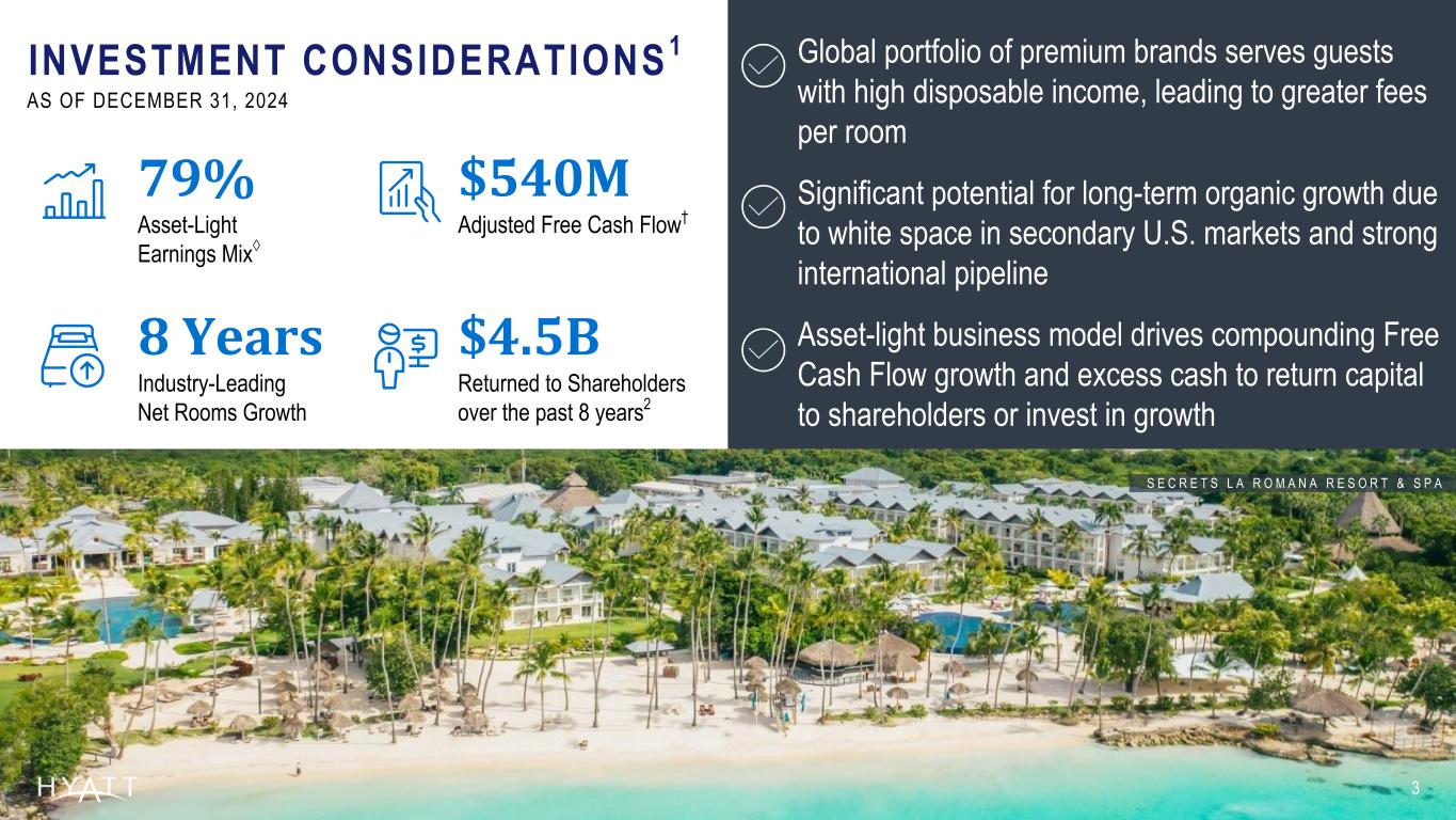 Disclaimers 2 Forward-Looking Statements Forward-Looking Statements in this presentation, which are not historical facts, are forward-looking statements within the meaning of the Private Securities Litigation Reform Act of 1995. These statements include statements about the Company's plans, strategies, outlook, the number of properties we expect to open in the future, the expected timing and payment of dividends, the Company's 2025 outlook (including and excluding the Playa Hotels Acquisition), including the Company's expected System-wide Hotels RevPAR Growth, Net Rooms Growth, Net Income, Gross Fees, Adjusted G&A Expenses, Adjusted EBITDA, Capital Expenditures, and Adjusted Free Cash Flow, the planned Playa Real Estate Transaction and our ability to reduce our owned real estate asset base within targeted timeframes and at expected values, financial performance, prospective or future events and involve known and unknown risks that are difficult to predict. As a result, the Company's actual results, performance or achievements may differ materially from those expressed or implied by these forward-looking statements. In some cases, you can identify forward-looking statements by the use of words such as "may," "could," "expect," "intend," "plan," "seek," "anticipate," "believe," "estimate," "predict," "potential," "continue," "likely," "will," "would" and variations of these terms and similar expressions, or the negative of these terms or similar expressions. Such forward-looking statements are necessarily based upon estimates and assumptions that, while considered reasonable by the Company and the Company's management, are inherently uncertain. Factors that may cause actual results to differ materially from current expectations include, but are not limited to: the effects that the announcement or pendency of the planned Playa Real Estate Transaction may have on us, the occurrence of any event, change or other circumstance that could give rise to the termination of the share purchase agreement; the effects that any termination of the share purchase agreement may have on us or our business; failure to successfully complete the planned Playa Real Estate Transaction; legal proceedings that may be instituted related to the planned Playa Real Estate Transaction; significant and unexpected costs, charges or expenses related to the planned Playa Real Estate Transaction; inability to obtain regulatory or governmental approvals or to obtain such approvals on satisfactory conditions, general economic uncertainty in key global markets and a worsening of global economic conditions or low levels of economic growth; the rate and pace of economic recovery following economic downturns; global supply chain constraints and interruptions, rising costs of construction-related labor and materials, and increases in costs due to inflation or other factors that may not be fully offset by increases in revenues in our business; risks affecting the luxury, resort, and all-inclusive lodging segments; levels of spending in business, leisure, and group segments, as well as consumer confidence; declines in occupancy and average daily rate; limited visibility with respect to future bookings; loss of key personnel; domestic and international political and geopolitical conditions, including political or civil unrest or changes in trade policy; the impact of global tariff policies or regulations; hostilities, or fear of hostilities, including future terrorist attacks, that affect travel; travel-related accidents; natural or man-made disasters, weather and climate-related events, such as hurricanes, earthquakes, tsunamis, tornadoes, droughts, floods, wildfires, oil spills, nuclear incidents, and global outbreaks of pandemics or contagious diseases, or fear of such outbreaks; our ability to successfully achieve specified levels of operating profits at hotels that have performance tests or guarantees in favor of our third-party owners; the impact of hotel renovations and redevelopments; risks associated with our capital allocation plans, share repurchase program, and dividend payments, including a reduction in, or elimination or suspension of, repurchase activity or dividend payments; the seasonal and cyclical nature of the real estate and hospitality businesses; changes in distribution arrangements, such as through internet travel intermediaries; changes in the tastes and preferences of our customers; relationships with colleagues and labor unions and changes in labor laws; the financial condition of, and our relationships with, third-party owners, franchisees, and hospitality venture partners; the possible inability of third-party owners, franchisees, or development partners to access the capital necessary to fund current operations or implement our plans for growth; risks associated with potential acquisitions and dispositions and our ability to successfully integrate completed acquisitions with existing operations or realize anticipated synergies; failure to successfully complete proposed transactions, including the failure to satisfy closing conditions or obtain required approvals; our ability to successfully complete dispositions of certain of our owned real estate assets within targeted timeframes and at expected values; our ability to maintain effective internal control over financial reporting and disclosure controls and procedures; declines in the value of our real estate assets; unforeseen terminations of our management and hotel services agreements or franchise agreements; changes in federal, state, local, or foreign tax law; increases in interest rates, wages, and other operating costs; foreign exchange rate fluctuations or currency restructurings; risks associated with the introduction of new brand concepts, including lack of acceptance of new brands or innovation; general volatility of the capital markets and our ability to access such markets; changes in the competitive environment in our industry, industry cons