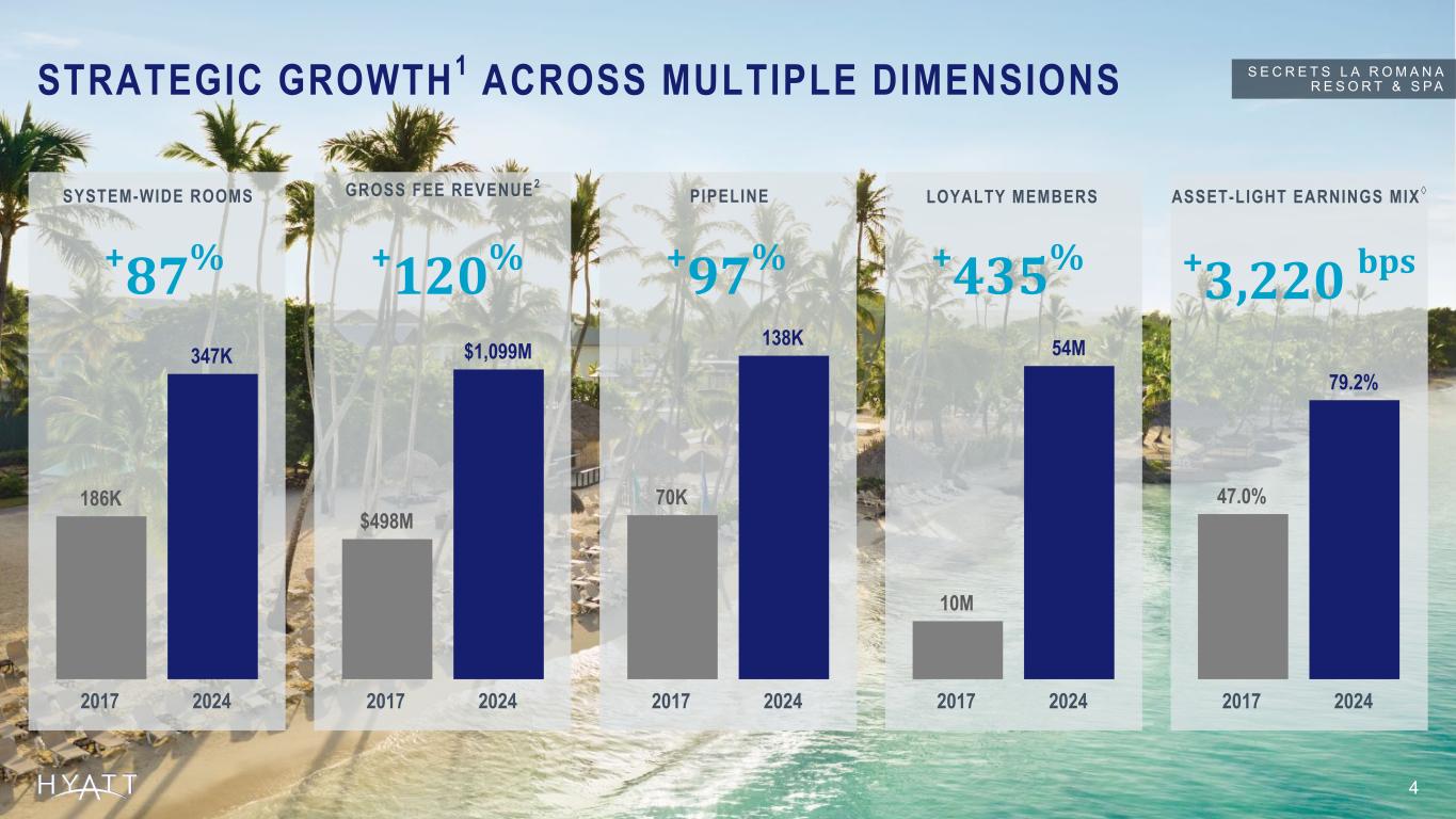 INVESTMENT CONSIDERATIONS 1 3 79% Asset-Light Earnings Mix◊ 8 Years Industry-Leading Net Rooms Growth Global portfolio of premium brands serves guests with high disposable income, leading to greater fees per room Significant potential for long-term organic growth due to white space in secondary U.S. markets and strong international pipeline Asset-light business model drives compounding Free Cash Flow growth and excess cash to return capital to shareholders or invest in growth $4.5B Returned to Shareholders over the past 8 years2 $540M Adjusted Free Cash Flow† Source Notes: Updated annually, data to match YE 2024. S E C R E T S L A R O M A N A R E S O R T & S P A Footnotes: 1 Metrics presented and growth rate comparison against larger competitors are as of December 31, 2024. 2 Returned to shareholders through share repurchases and dividends. Figures calculated from January 1, 2017 - December 31, 2024. AS OF DECEMBER 31, 2024