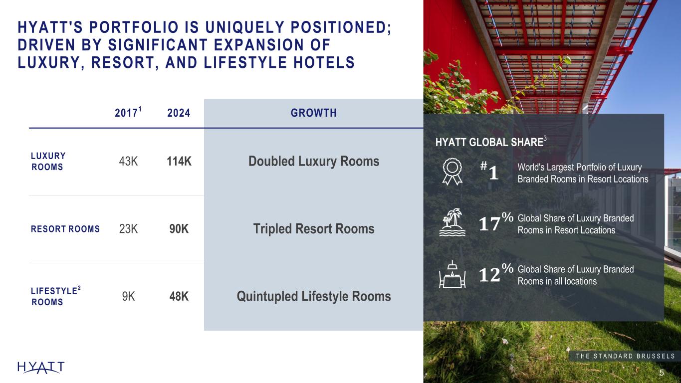STRATEGIC GROWTH1 ACROSS MULTIPLE DIMENSIONS 4 +87% +120% +97% +435% +3,220 bps SYSTEM-WIDE ROOMS GROSS FEE REVENUE2 PIPELINE LOYALTY MEMBERS ASSET-LIGHT EARNINGS MIX◊  Source Notes: Updated Annually, data to match YE 2024. Support: Hyatt Hotels\CHICO-Team-Corporate FPA - Documents\Fact Pack and QA Document\2024\Investor Consideration Deck Support\Annual \ Strategic Growth support file -2009 Data can be found under 2009 folder System-wide rooms based on Inventory as of December 31, 2009 Fee Revenue, pipeline, and loyalty members based on Hyatt 2009 Annual Report -2017 Data can be found under 2017 folder System-wide rooms based on Inventory as of December 31, 2017 Fee Revenue and pipeline based on Q4 2017 Earnings Release Loyalty members based on 10-K 2017 -2023 Data System-wide rooms based on Inventory as of December 31, 2023 Fee Revenue and pipeline based on Q4 2023 Earnings Release Loyalty members based on 10-K 2023 as well as Enrollment and Program member count Q4 2023 Footnotes: 1 Calculated growth comparisons based on years ended December 31, 2017 and December 31, 2024. 2 Gross fee revenue in 2017 represents management, franchise, and other fees following the adoption of ASC 606 during the year ended December 31, 2018 as disclosed in our 2018 Form 10-K. 186K 347K 2017 2024 $498M $1,099M 2017 2024 70K 138K 2017 2024 10M 54M 2017 2024 47.0% 79.2% 2017 2024 S E C R E T S L A R O M A N A R E S O R T & S P A