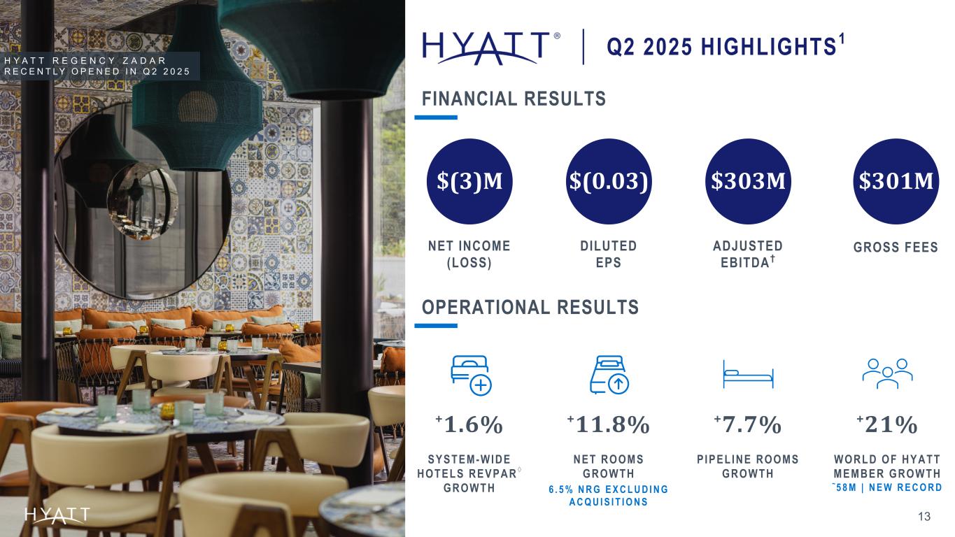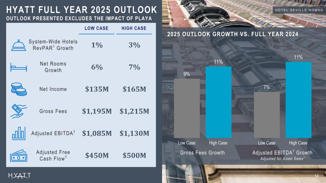ADJUSTED EBITDA† DILUTED EPS GROSS FEES $(3)M NET INCOME (LOSS) $(0.03) $303M $301M OPERATIONAL RESULTS FINANCIAL RESULTS +7.7% PIPEL INE ROOMS GROWTH +11.8% NET ROOMS GROWTH 6 . 5 % N R G E X C L U D I N G A C Q U I S I T I O N S +1.6% SYSTEM-WIDE HOTELS REVPAR ◊ GROWTH +21% WORLD OF HYATT MEMBER GROWTH ~5 8 M | N E W R E C O R D Source Notes: Operational Results: RevPAR and NRG are linked to ER. Pipeline increase should be calculated vs prior year’s ER (rounded pipeline) vs current year rounded pipeline #. World of Hyatt Member growth: Teams\Hyatt Hotels\CHICO-Team- Corporate FPA - Documents\Hotel FP&A\World of Hyatt Enrollments Reported Pipeline: – 2023 YE: 127K – 2024 YE: 138K – 2024 Q1: 129K 13 Q2 2025 HIGHLIGHTS1 • Exceeded asset sell down commitment announced in August 2021, realizing $2.6 billion of gross proceeds from asset sales, net of acquisitions, at a multiple of 13.3x over the duration of the commitment1 • Acquired Standard International including iconic The Standard and Bunkhouse Hotels brands, adding 25 open hotels with ~2,500 rooms to Hyatt's portfolio during 2024 • Entered into a long-term, asset-light strategic joint venture with Grupo Piñero, adding 22 Bahia Principe- branded all-inclusive resorts with ~12,000 rooms to Hyatt's portfolio • Entered into a long-term licensing agreement with The Venetian Resort Las Vegas, making ~7,000 luxury rooms at The Venetian and The Palazzo at The Venetian Resort available through Hyatt booking channels HIGHLIGHTS Footnotes: 1 Figures as of June 30, 2025, and growth rates represent year-over-year comparisons from quarters ended June 30, 2024 and June 30, 2025. H Y A T T R E G E N C Y Z A D A R R E C E N T L Y O P E N E D I N Q 2 2 0 2 5