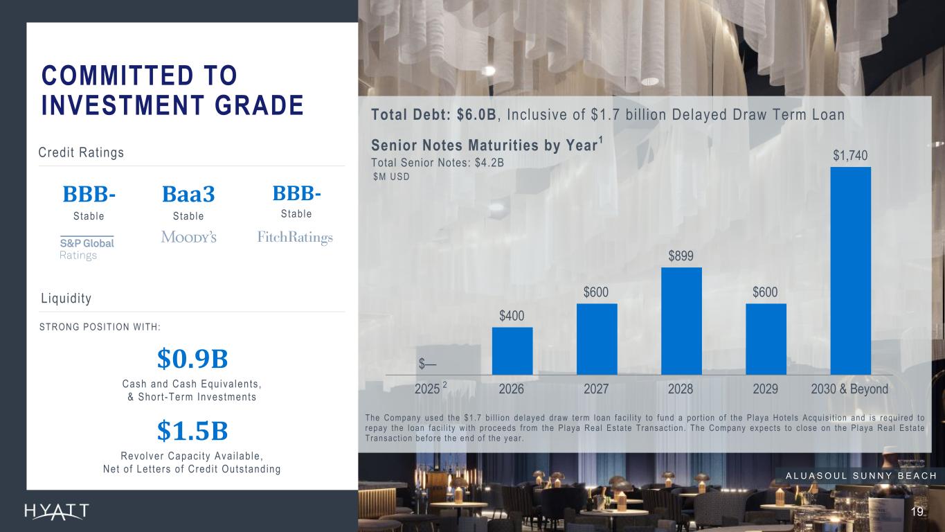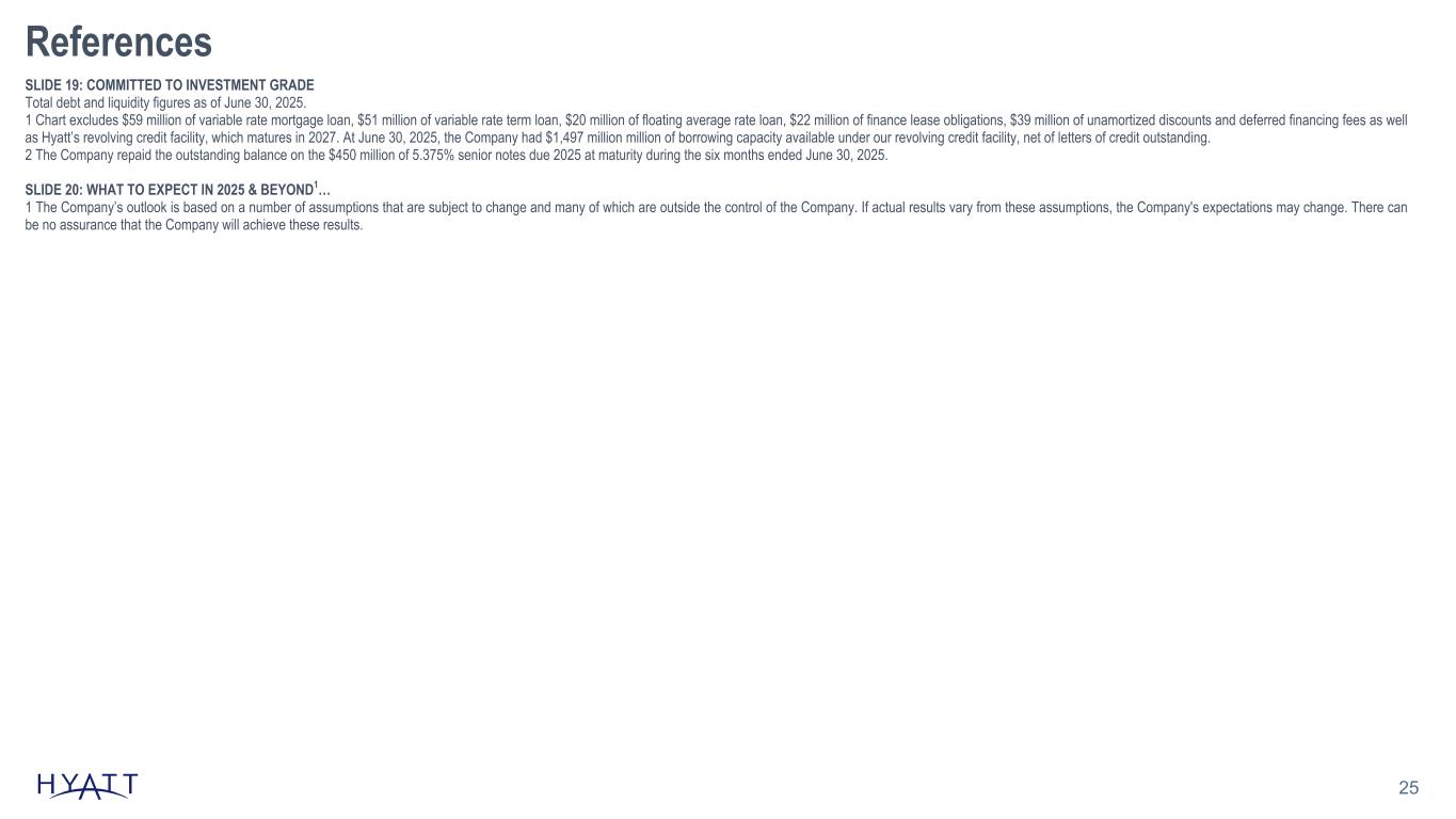 25 References SLIDE 19: COMMITTED TO INVESTMENT GRADE Total debt and liquidity figures as of June 30, 2025. 1 Chart excludes $59 million of variable rate mortgage loan, $51 million of variable rate term loan, $20 million of floating average rate loan, $22 million of finance lease obligations, $39 million of unamortized discounts and deferred financing fees as well as Hyatt’s revolving credit facility, which matures in 2027. At June 30, 2025, the Company had $1,497 million million of borrowing capacity available under our revolving credit facility, net of letters of credit outstanding. 2 The Company repaid the outstanding balance on the $450 million of 5.375% senior notes due 2025 at maturity during the six months ended June 30, 2025. SLIDE 20: WHAT TO EXPECT IN 2025 & BEYOND1… 1 The Company’s outlook is based on a number of assumptions that are subject to change and many of which are outside the control of the Company. If actual results vary from these assumptions, the Company's expectations may change. There can be no assurance that the Company will achieve these results.