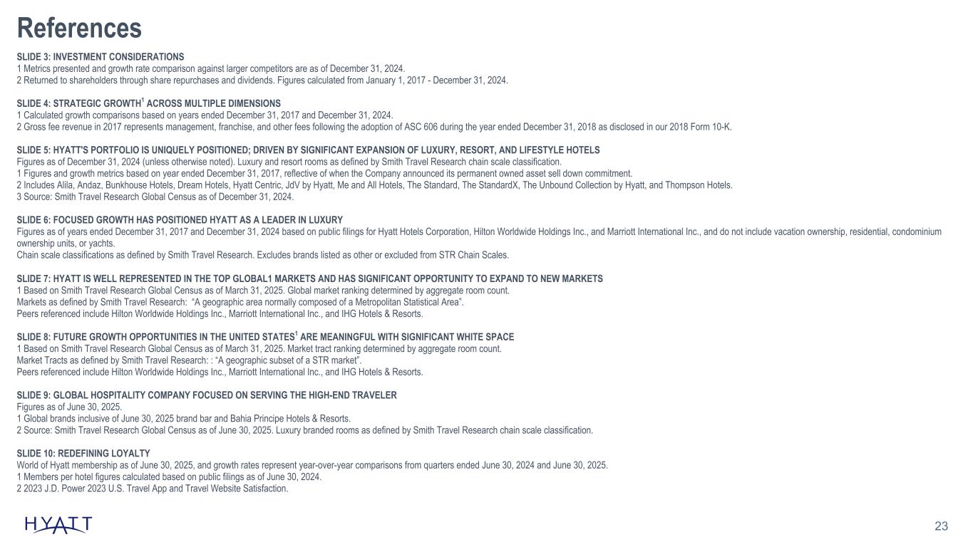 23 References SLIDE 3: INVESTMENT CONSIDERATIONS 1 Metrics presented and growth rate comparison against larger competitors are as of December 31, 2024. 2 Returned to shareholders through share repurchases and dividends. Figures calculated from January 1, 2017 - December 31, 2024. SLIDE 4: STRATEGIC GROWTH1 ACROSS MULTIPLE DIMENSIONS 1 Calculated growth comparisons based on years ended December 31, 2017 and December 31, 2024. 2 Gross fee revenue in 2017 represents management, franchise, and other fees following the adoption of ASC 606 during the year ended December 31, 2018 as disclosed in our 2018 Form 10-K. SLIDE 5: HYATT'S PORTFOLIO IS UNIQUELY POSITIONED; DRIVEN BY SIGNIFICANT EXPANSION OF LUXURY, RESORT, AND LIFESTYLE HOTELS Figures as of December 31, 2024 (unless otherwise noted). Luxury and resort rooms as defined by Smith Travel Research chain scale classification. 1 Figures and growth metrics based on year ended December 31, 2017, reflective of when the Company announced its permanent owned asset sell down commitment. 2 Includes Alila, Andaz, Bunkhouse Hotels, Dream Hotels, Hyatt Centric, JdV by Hyatt, Me and All Hotels, The Standard, The StandardX, The Unbound Collection by Hyatt, and Thompson Hotels. 3 Source: Smith Travel Research Global Census as of December 31, 2024. SLIDE 6: FOCUSED GROWTH HAS POSITIONED HYATT AS A LEADER IN LUXURY Figures as of years ended December 31, 2017 and December 31, 2024 based on public filings for Hyatt Hotels Corporation, Hilton Worldwide Holdings Inc., and Marriott International Inc., and do not include vacation ownership, residential, condominium ownership units, or yachts. Chain scale classifications as defined by Smith Travel Research. Excludes brands listed as other or excluded from STR Chain Scales. SLIDE 7: HYATT IS WELL REPRESENTED IN THE TOP GLOBAL1 MARKETS AND HAS SIGNIFICANT OPPORTUNITY TO EXPAND TO NEW MARKETS 1 Based on Smith Travel Research Global Census as of March 31, 2025. Global market ranking determined by aggregate room count. Markets as defined by Smith Travel Research: “A geographic area normally composed of a Metropolitan Statistical Area”. Peers referenced include Hilton Worldwide Holdings Inc., Marriott International Inc., and IHG Hotels & Resorts. SLIDE 8: FUTURE GROWTH OPPORTUNITIES IN THE UNITED STATES1 ARE MEANINGFUL WITH SIGNIFICANT WHITE SPACE 1 Based on Smith Travel Research Global Census as of March 31, 2025. Market tract ranking determined by aggregate room count. Market Tracts as defined by Smith Travel Research: : “A geographic subset of a STR market”. Peers referenced include Hilton Worldwide Holdings Inc., Marriott International Inc., and IHG Hotels & Resorts. SLIDE 9: GLOBAL HOSPITALITY COMPANY FOCUSED ON SERVING THE HIGH-END TRAVELER Figures as of June 30, 2025. 1 Global brands inclusive of June 30, 2025 brand bar and Bahia Principe Hotels & Resorts. 2 Source: Smith Travel Research Global Census as of June 30, 2025. Luxury branded rooms as defined by Smith Travel Research chain scale classification. SLIDE 10: REDEFINING LOYALTY World of Hyatt membership as of June 30, 2025, and growth rates represent year-over-year comparisons from quarters ended June 30, 2024 and June 30, 2025. 1 Members per hotel figures calculated based on public filings as of June 30, 2024. 2 2023 J.D. Power 2023 U.S. Travel App and Travel Website Satisfaction.