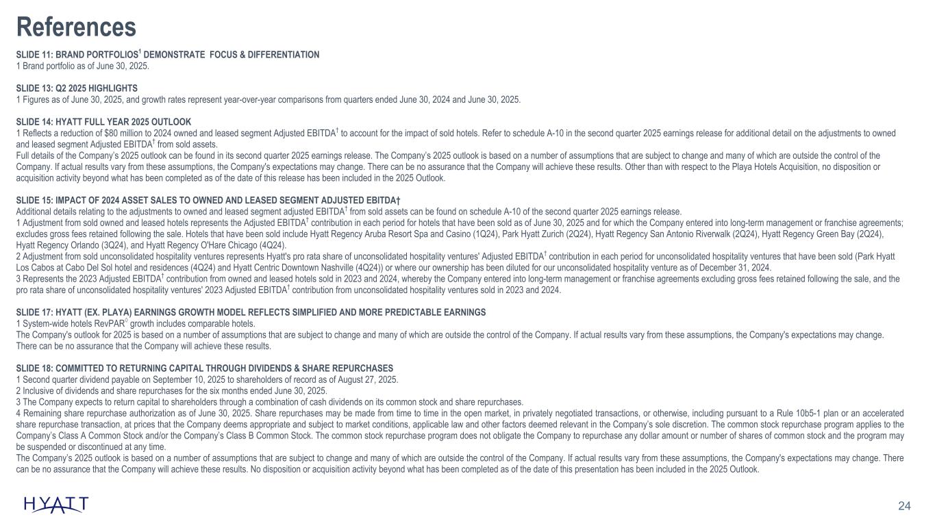 24 References SLIDE 11: BRAND PORTFOLIOS1 DEMONSTRATE FOCUS & DIFFERENTIATION 1 Brand portfolio as of June 30, 2025. SLIDE 13: Q2 2025 HIGHLIGHTS 1 Figures as of June 30, 2025, and growth rates represent year-over-year comparisons from quarters ended June 30, 2024 and June 30, 2025. SLIDE 14: HYATT FULL YEAR 2025 OUTLOOK 1 Reflects a reduction of $80 million to 2024 owned and leased segment Adjusted EBITDA† to account for the impact of sold hotels. Refer to schedule A-10 in the second quarter 2025 earnings release for additional detail on the adjustments to owned and leased segment Adjusted EBITDA† from sold assets. Full details of the Company’s 2025 outlook can be found in its second quarter 2025 earnings release. The Company’s 2025 outlook is based on a number of assumptions that are subject to change and many of which are outside the control of the Company. If actual results vary from these assumptions, the Company's expectations may change. There can be no assurance that the Company will achieve these results. Other than with respect to the Playa Hotels Acquisition, no disposition or acquisition activity beyond what has been completed as of the date of this release has been included in the 2025 Outlook. SLIDE 15: IMPACT OF 2024 ASSET SALES TO OWNED AND LEASED SEGMENT ADJUSTED EBITDA† Additional details relating to the adjustments to owned and leased segment adjusted EBITDA† from sold assets can be found on schedule A-10 of the second quarter 2025 earnings release. 1 Adjustment from sold owned and leased hotels represents the Adjusted EBITDA† contribution in each period for hotels that have been sold as of June 30, 2025 and for which the Company entered into long-term management or franchise agreements; excludes gross fees retained following the sale. Hotels that have been sold include Hyatt Regency Aruba Resort Spa and Casino (1Q24), Park Hyatt Zurich (2Q24), Hyatt Regency San Antonio Riverwalk (2Q24), Hyatt Regency Green Bay (2Q24), Hyatt Regency Orlando (3Q24), and Hyatt Regency O'Hare Chicago (4Q24). 2 Adjustment from sold unconsolidated hospitality ventures represents Hyatt's pro rata share of unconsolidated hospitality ventures' Adjusted EBITDA† contribution in each period for unconsolidated hospitality ventures that have been sold (Park Hyatt Los Cabos at Cabo Del Sol hotel and residences (4Q24) and Hyatt Centric Downtown Nashville (4Q24)) or where our ownership has been diluted for our unconsolidated hospitality venture as of December 31, 2024. 3 Represents the 2023 Adjusted EBITDA† contribution from owned and leased hotels sold in 2023 and 2024, whereby the Company entered into long-term management or franchise agreements excluding gross fees retained following the sale, and the pro rata share of unconsolidated hospitality ventures' 2023 Adjusted EBITDA† contribution from unconsolidated hospitality ventures sold in 2023 and 2024. SLIDE 17: HYATT (EX. PLAYA) EARNINGS GROWTH MODEL REFLECTS SIMPLIFIED AND MORE PREDICTABLE EARNINGS 1 System-wide hotels RevPAR◊ growth includes comparable hotels. The Company's outlook for 2025 is based on a number of assumptions that are subject to change and many of which are outside the control of the Company. If actual results vary from these assumptions, the Company's expectations may change. There can be no assurance that the Company will achieve these results. SLIDE 18: COMMITTED TO RETURNING CAPITAL THROUGH DIVIDENDS & SHARE REPURCHASES 1 Second quarter dividend payable on September 10, 2025 to shareholders of record as of August 27, 2025. 2 Inclusive of dividends and share repurchases for the six months ended June 30, 2025. 3 The Company expects to return capital to shareholders through a combination of cash dividends on its common stock and share repurchases. 4 Remaining share repurchase authorization as of June 30, 2025. Share repurchases may be made from time to time in the open market, in privately negotiated transactions, or otherwise, including pursuant to a Rule 10b5-1 plan or an accelerated share repurchase transaction, at prices that the Company deems appropriate and subject to market conditions, applicable law and other factors deemed relevant in the Company’s sole discretion. The common stock repurchase program applies to the Company’s Class A Common Stock and/or the Company’s Class B Common Stock. The common stock repurchase program does not obligate the Company to repurchase any dollar amount or number of shares of common stock and the program may be suspended or discontinued at any time. The Company’s 2025 outlook is based on a number of assumptions that are subject to change and many of which are outside the control of the Company. If actual results vary from these assumptions, the Company's expectations may change. There can be no assurance that the Company will achieve these results. No disposition or acquisition activity beyond what has been completed as of the date of this presentation has been included in the 2025 Outlook.