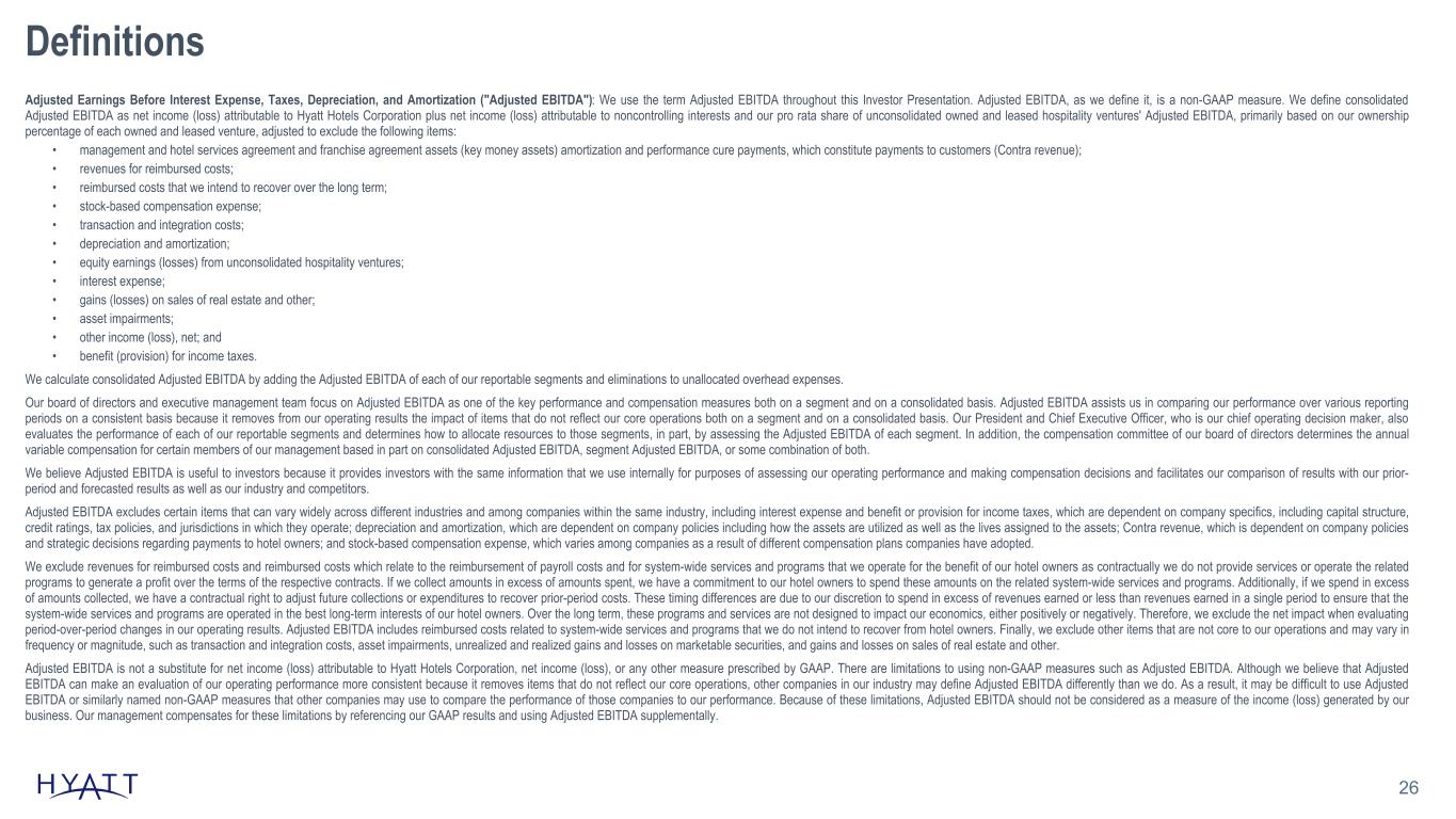 26 Definitions Adjusted Earnings Before Interest Expense, Taxes, Depreciation, and Amortization ("Adjusted EBITDA"): We use the term Adjusted EBITDA throughout this Investor Presentation. Adjusted EBITDA, as we define it, is a non-GAAP measure. We define consolidated Adjusted EBITDA as net income (loss) attributable to Hyatt Hotels Corporation plus net income (loss) attributable to noncontrolling interests and our pro rata share of unconsolidated owned and leased hospitality ventures' Adjusted EBITDA, primarily based on our ownership percentage of each owned and leased venture, adjusted to exclude the following items: • management and hotel services agreement and franchise agreement assets (key money assets) amortization and performance cure payments, which constitute payments to customers (Contra revenue); • revenues for reimbursed costs; • reimbursed costs that we intend to recover over the long term; • stock-based compensation expense; • transaction and integration costs; • depreciation and amortization; • equity earnings (losses) from unconsolidated hospitality ventures; • interest expense; • gains (losses) on sales of real estate and other; • asset impairments; • other income (loss), net; and • benefit (provision) for income taxes. We calculate consolidated Adjusted EBITDA by adding the Adjusted EBITDA of each of our reportable segments and eliminations to unallocated overhead expenses. Our board of directors and executive management team focus on Adjusted EBITDA as one of the key performance and compensation measures both on a segment and on a consolidated basis. Adjusted EBITDA assists us in comparing our performance over various reporting periods on a consistent basis because it removes from our operating results the impact of items that do not reflect our core operations both on a segment and on a consolidated basis. Our President and Chief Executive Officer, who is our chief operating decision maker, also evaluates the performance of each of our reportable segments and determines how to allocate resources to those segments, in part, by assessing the Adjusted EBITDA of each segment. In addition, the compensation committee of our board of directors determines the annual variable compensation for certain members of our management based in part on consolidated Adjusted EBITDA, segment Adjusted EBITDA, or some combination of both. We believe Adjusted EBITDA is useful to investors because it provides investors with the same information that we use internally for purposes of assessing our operating performance and making compensation decisions and facilitates our comparison of results with our prior- period and forecasted results as well as our industry and competitors. Adjusted EBITDA excludes certain items that can vary widely across different industries and among companies within the same industry, including interest expense and benefit or provision for income taxes, which are dependent on company specifics, including capital structure, credit ratings, tax policies, and jurisdictions in which they operate; depreciation and amortization, which are dependent on company policies including how the assets are utilized as well as the lives assigned to the assets; Contra revenue, which is dependent on company policies and strategic decisions regarding payments to hotel owners; and stock-based compensation expense, which varies among companies as a result of different compensation plans companies have adopted. We exclude revenues for reimbursed costs and reimbursed costs which relate to the reimbursement of payroll costs and for system-wide services and programs that we operate for the benefit of our hotel owners as contractually we do not provide services or operate the related programs to generate a profit over the terms of the respective contracts. If we collect amounts in excess of amounts spent, we have a commitment to our hotel owners to spend these amounts on the related system-wide services and programs. Additionally, if we spend in excess of amounts collected, we have a contractual right to adjust future collections or expenditures to recover prior-period costs. These timing differences are due to our discretion to spend in excess of revenues earned or less than revenues earned in a single period to ensure that the system-wide services and programs are operated in the best long-term interests of our hotel owners. Over the long term, these programs and services are not designed to impact our economics, either positively or negatively. Therefore, we exclude the net impact when evaluating period-over-period changes in our operating results. Adjusted EBITDA includes reimbursed costs related to system-wide services and programs that we do not intend to recover from hotel owners. Finally, we exclude other items that are not core to our operations and may vary in frequency or magnitude, such as transaction and integration costs, asset impairments, unrealized and realized gains and losses on marketable securities, and gains and losses on sales of real estate and other. Adjusted EBITDA is not a substitute for net income (loss) attributable to Hyatt Hotels Corporation, net income (loss), or any other measure prescribed by GAAP. There are limitations to using non-GAAP measures such as Adjusted EBITDA. Although we believe that Adjusted EBITDA can make an evaluation of our operating performance more consistent because it removes items that do not reflect our core operations, other companies in our industry may define Adjusted EBITDA differently than we do. As a result, it may be difficult to use Adjusted EBITDA or similarly named non-GAAP measures that other companies may use to compare the performance of those companies to our performance. Because of these limitations, Adjusted EBITDA should not be considered as a measure of the income (loss) generated by our business. Our management compensates for these limitations by referencing our GAAP results and using Adjusted E