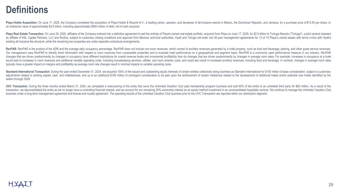 28 Definitions Playa Hotels Acquisition: On June 17, 2025, the Company completed the acquisition of Playa Hotels & Resorts N.V., a leading owner, operator, and developer of all-inclusive resorts in Mexico, the Dominican Republic, and Jamaica, for a purchase price of $13.50 per share, or an enterprise value of approximately $2.6 billion, including approximately $900 million of debt, net of cash acquired. Playa Real Estate Transaction: On June 29, 2025, affiliates of the Company entered into a definitive agreement to sell the entirely of Playa's owned real estate portfolio, acquired from Playa on June 17, 2025, for $2.0 billion to Tortuga Resorts ("Tortuga"), a joint venture between an affiliate of KSL Capital Partners, LLC and Rodina, subject to customary closing conditions and approval from Mexican anti-trust authorities. Hyatt and Tortuga will enter into 50-year management agreements for 13 of 15 Playa’s owned assets with terms in-line with Hyatt’s existing all-inclusive fee structure, while the remaining two properties are under separate contractual arrangements. RevPAR: RevPAR is the product of the ADR and the average daily occupancy percentage. RevPAR does not include non-room revenues, which consist of ancillary revenues generated by a hotel property, such as food and beverage, parking, and other guest service revenues. Our management uses RevPAR to identify trend information with respect to room revenues from comparable properties and to evaluate hotel performance on a geographical and segment basis. RevPAR is a commonly used performance measure in our industry. RevPAR changes that are driven predominantly by changes in occupancy have different implications for overall revenue levels and incremental profitability than do changes that are driven predominantly by changes in average room rates. For example, increases in occupancy at a hotel would lead to increases in room revenues and additional variable operating costs, including housekeeping services, utilities, and room amenity costs, and could also result in increased ancillary revenues, including food and beverage. In contrast, changes in average room rates typically have a greater impact on margins and profitability as average room rate changes result in minimal impacts to variable operating costs. Standard International Transaction: During the year ended December 31, 2024, we acquired 100% of the issued and outstanding equity interests of certain entities collectively doing business as Standard International for $150 million of base consideration, subject to customary adjustments related to working capital, cash, and indebtedness, and up to an additional $185 million of contingent consideration to be paid upon the achievement of certain milestones related to the development of additional hotels and/or potential new hotels identified by the sellers through 2028. UVC Transaction: During the three months ended March 31, 2024, we completed a restructuring of the entity that owns the Unlimited Vacation Club paid membership program business and sold 80% of the entity to an unrelated third party for $80 million. As a result of the transaction, we deconsolidated the entity as we no longer have a controlling financial interest, and we account for our remaining 20% ownership interest as an equity method investment in an unconsolidated hospitality venture. We continue to manage the Unlimited Vacation Club business under a long-term management agreement and license and royalty agreement. The operating results of the Unlimited Vacation Club business prior to the UVC Transaction are reported within our distribution segment.