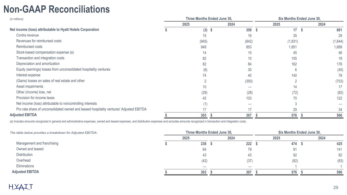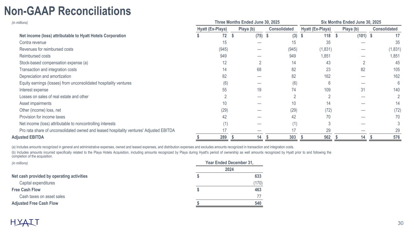 Non-GAAP Reconciliations 29 (in millions) Three Months Ended June 30, Six Months Ended June 30, 2025 2024 2025 2024 Net income (loss) attributable to Hyatt Hotels Corporation $ (3) $ 359 $ 17 $ 881 Contra revenue 15 16 35 29 Revenues for reimbursed costs (945) (842) (1,831) (1,644) Reimbursed costs 949 853 1,851 1,689 Stock-based compensation expense (a) 14 15 45 46 Transaction and integration costs 82 10 105 18 Depreciation and amortization 82 84 162 176 Equity (earnings) losses from unconsolidated hospitality ventures (6) 30 6 (45) Interest expense 74 40 140 78 (Gains) losses on sales of real estate and other 2 (350) 2 (753) Asset impairments 10 — 14 17 Other (income) loss, net (29) (28) (72) (82) Provision for income taxes 42 103 70 122 Net income (loss) attributable to noncontrolling interests (1) — 3 — Pro rata share of unconsolidated owned and leased hospitality ventures' Adjusted EBITDA 17 17 29 34 Adjusted EBITDA $ 303 $ 307 $ 576 $ 566 (a) Includes amounts recognized in general and administrative expenses, owned and leased expenses, and distribution expenses and excludes amounts recognized in transaction and integration costs. The table below provides a breakdown for Adjusted EBITDA: Three Months Ended June 30, Six Months Ended June 30, 2025 2024 2025 2024 Management and franchising $ 238 $ 222 $ 474 $ 425 Owned and leased 64 79 91 141 Distribution 43 43 92 82 Overhead (42) (37) (82) (83) Eliminations — — 1 1 Adjusted EBITDA $ 303 $ 307 $ 576 $ 566 Source Notes: linked to ER schedule