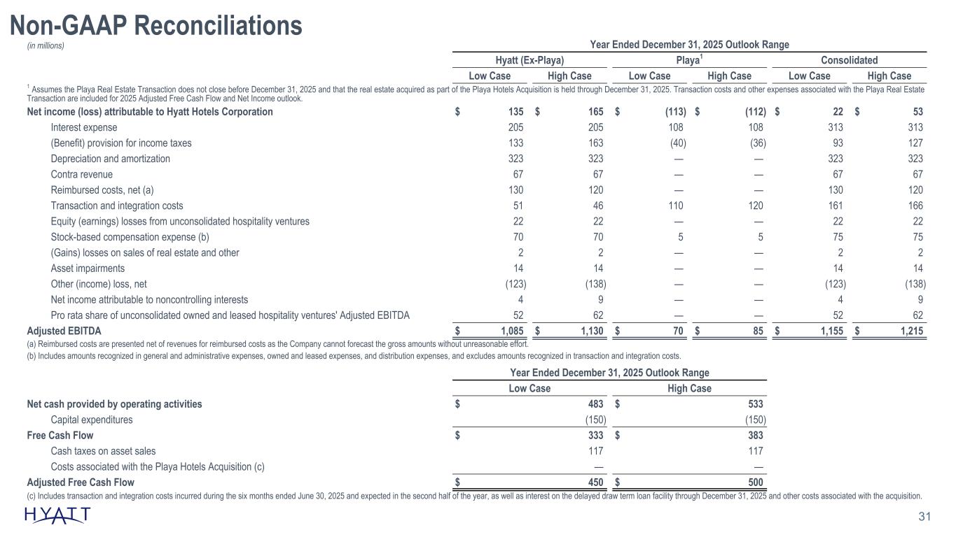 Non-GAAP Reconciliations 30 (in millions) Three Months Ended June 30, 2025 Six Months Ended June 30, 2025 Hyatt (Ex-Playa) Playa (b) Consolidated Hyatt (Ex-Playa) Playa (b) Consolidated Net income (loss) attributable to Hyatt Hotels Corporation $ 72 $ (75) $ (3) $ 118 $ (101) $ 17 Contra revenue 15 — 15 35 — 35 Revenues for reimbursed costs (945) — (945) (1,831) — (1,831) Reimbursed costs 949 — 949 1,851 — 1,851 Stock-based compensation expense (a) 12 2 14 43 2 45 Transaction and integration costs 14 68 82 23 82 105 Depreciation and amortization 82 — 82 162 — 162 Equity earnings (losses) from unconsolidated hospitality ventures (6) — (6) 6 — 6 Interest expense 55 19 74 109 31 140 Losses on sales of real estate and other 2 — 2 2 — 2 Asset impairments 10 — 10 14 — 14 Other (income) loss, net (29) — (29) (72) — (72) Provision for income taxes 42 — 42 70 — 70 Net income (loss) attributable to noncontrolling interests (1) — (1) 3 — 3 Pro rata share of unconsolidated owned and leased hospitality ventures' Adjusted EBITDA 17 — 17 29 — 29 Adjusted EBITDA $ 289 $ 14 $ 303 $ 562 $ 14 $ 576 (a) Includes amounts recognized in general and administrative expenses, owned and leased expenses, and distribution expenses and excludes amounts recognized in transaction and integration costs. (b) Includes amounts incurred specifically related to the Playa Hotels Acquisition, including amounts recognized by Playa during Hyatt's period of ownership as well amounts recognized by Hyatt prior to and following the completion of the acquisition. (in millions) Year Ended December 31, 2024 Net cash provided by operating activities $ 633 Capital expenditures (170) Free Cash Flow $ 463 Cash taxes on asset sales 77 Adjusted Free Cash Flow $ 540 Source Notes: linked to ER schedule