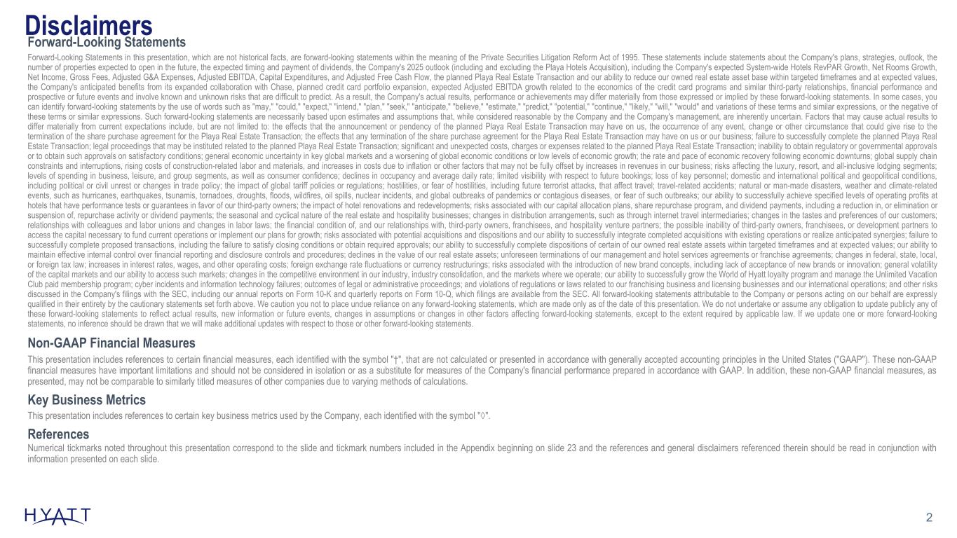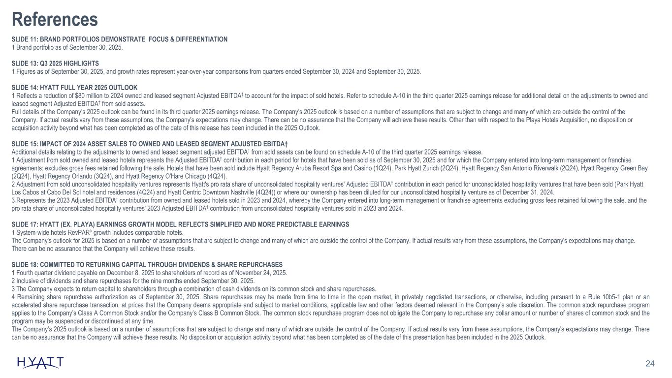 24 References SLIDE 11: BRAND PORTFOLIOS DEMONSTRATE FOCUS & DIFFERENTIATION 1 Brand portfolio as of September 30, 2025. SLIDE 13: Q3 2025 HIGHLIGHTS 1 Figures as of September 30, 2025, and growth rates represent year-over-year comparisons from quarters ended September 30, 2024 and September 30, 2025. SLIDE 14: HYATT FULL YEAR 2025 OUTLOOK 1 Reflects a reduction of $80 million to 2024 owned and leased segment Adjusted EBITDA† to account for the impact of sold hotels. Refer to schedule A-10 in the third quarter 2025 earnings release for additional detail on the adjustments to owned and leased segment Adjusted EBITDA† from sold assets. Full details of the Company’s 2025 outlook can be found in its third quarter 2025 earnings release. The Company’s 2025 outlook is based on a number of assumptions that are subject to change and many of which are outside the control of the Company. If actual results vary from these assumptions, the Company's expectations may change. There can be no assurance that the Company will achieve these results. Other than with respect to the Playa Hotels Acquisition, no disposition or acquisition activity beyond what has been completed as of the date of this release has been included in the 2025 Outlook. SLIDE 15: IMPACT OF 2024 ASSET SALES TO OWNED AND LEASED SEGMENT ADJUSTED EBITDA† Additional details relating to the adjustments to owned and leased segment adjusted EBITDA† from sold assets can be found on schedule A-10 of the third quarter 2025 earnings release. 1 Adjustment from sold owned and leased hotels represents the Adjusted EBITDA† contribution in each period for hotels that have been sold as of September 30, 2025 and for which the Company entered into long-term management or franchise agreements; excludes gross fees retained following the sale. Hotels that have been sold include Hyatt Regency Aruba Resort Spa and Casino (1Q24), Park Hyatt Zurich (2Q24), Hyatt Regency San Antonio Riverwalk (2Q24), Hyatt Regency Green Bay (2Q24), Hyatt Regency Orlando (3Q24), and Hyatt Regency O'Hare Chicago (4Q24). 2 Adjustment from sold unconsolidated hospitality ventures represents Hyatt's pro rata share of unconsolidated hospitality ventures' Adjusted EBITDA† contribution in each period for unconsolidated hospitality ventures that have been sold (Park Hyatt Los Cabos at Cabo Del Sol hotel and residences (4Q24) and Hyatt Centric Downtown Nashville (4Q24)) or where our ownership has been diluted for our unconsolidated hospitality venture as of December 31, 2024. 3 Represents the 2023 Adjusted EBITDA† contribution from owned and leased hotels sold in 2023 and 2024, whereby the Company entered into long-term management or franchise agreements excluding gross fees retained following the sale, and the pro rata share of unconsolidated hospitality ventures' 2023 Adjusted EBITDA† contribution from unconsolidated hospitality ventures sold in 2023 and 2024. SLIDE 17: HYATT (EX. PLAYA) EARNINGS GROWTH MODEL REFLECTS SIMPLIFIED AND MORE PREDICTABLE EARNINGS 1 System-wide hotels RevPAR◊ growth includes comparable hotels. The Company's outlook for 2025 is based on a number of assumptions that are subject to change and many of which are outside the control of the Company. If actual results vary from these assumptions, the Company's expectations may change. There can be no assurance that the Company will achieve these results. SLIDE 18: COMMITTED TO RETURNING CAPITAL THROUGH DIVIDENDS & SHARE REPURCHASES 1 Fourth quarter dividend payable on December 8, 2025 to shareholders of record as of November 24, 2025. 2 Inclusive of dividends and share repurchases for the nine months ended September 30, 2025. 3 The Company expects to return capital to shareholders through a combination of cash dividends on its common stock and share repurchases. 4 Remaining share repurchase authorization as of September 30, 2025. Share repurchases may be made from time to time in the open market, in privately negotiated transactions, or otherwise, including pursuant to a Rule 10b5-1 plan or an accelerated share repurchase transaction, at prices that the Company deems appropriate and subject to market conditions, applicable law and other factors deemed relevant in the Company’s sole discretion. The common stock repurchase program applies to the Company’s Class A Common Stock and/or the Company’s Class B Common Stock. The common stock repurchase program does not obligate the Company to repurchase any dollar amount or number of shares of common stock and the program may be suspended or discontinued at any time. The Company’s 2025 outlook is based on a number of assumptions that are subject to change and many of which are outside the control of the Company. If actual results vary from these assumptions, the Company's expectations may change. There can be no assurance that the Company will achieve these results. No disposition or acquisition activity beyond what has been completed as of the date of this presentation has been included in the 2025 Outlook.