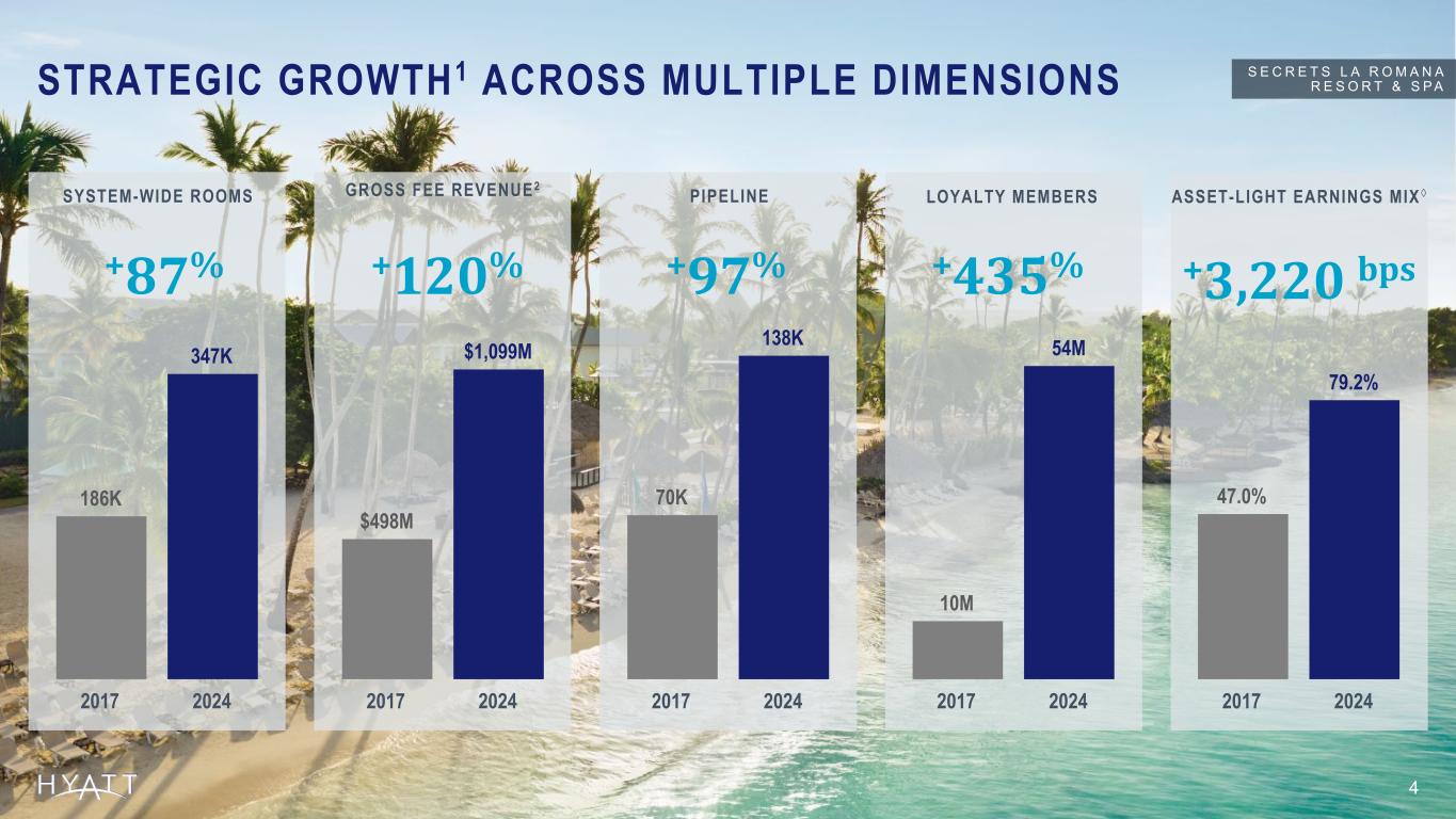 INVESTMENT CONSIDERATIONS 1 3 79% Asset-Light Earnings Mix◊ 8 Years Industry-Leading Net Rooms Growth Global portfolio of premium brands serves guests with high disposable income, leading to greater fees per room Significant potential for long-term organic growth due to white space in secondary U.S. markets and strong international pipeline Asset-light business model drives compounding Free Cash Flow growth and excess cash to return capital to shareholders or invest in growth $4.5B Returned to Shareholders over the past 8 years2 $540M Adjusted Free Cash Flow† Source Notes: Updated annually, data to match YE 2024. S E C R E T S L A R O M A N A R E S O R T & S P A Footnotes: 1 Metrics presented and growth rate comparison against larger competitors are as of December 31, 2024. 2 Returned to shareholders through share repurchases and dividends. Figures calculated from January 1, 2017 - December 31, 2024. AS OF DECEMBER 31, 2024