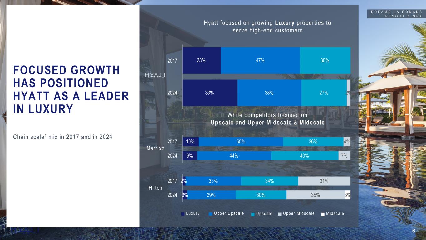 20171 2024 GROWTH LUXURY ROOMS 43K 114K Doubled Luxury Rooms RESORT ROOMS 23K 90K Tripled Resort Rooms LIFESTYLE2 ROOMS 9K 48K Quintupled Lifestyle Rooms HYATT'S PORTFOLIO IS UNIQUELY POSITIONED; DRIVEN BY SIGNIFICANT EXPANSION OF LUXURY, RESORT, AND LIFESTYLE HOTELS 5 HYATT GLOBAL SHARE3 #1 World's Largest Portfolio of Luxury Branded Rooms in Resort Locations 17% Global Share of Luxury Branded Rooms in Resort Locations 12% Global Share of Luxury Branded Rooms in all locations T H E S T A N D A R D B R U S S E L S Source Notes: Updated Annually, data to match YE 2024. Support: Hyatt Hotels\CHICO-Team-Corporate FPA - Documents\Fact Pack and QA Document\202X\Investor Consideration Deck Support\Annual -Luxury, Lifestyle, and Resort rooms calculated based on HHC Inventory as of Year end and calculated based on Luxury Lifestyle or Resort Support file -Hyatt Global Share calculated based on STR census as of Year-end. Footnotes: Figures as of December 31, 2024 (unless otherwise noted). Luxury and resort rooms as defined by Smith Travel Research chain scale classification. 1 Figures and growth metrics based on year ended December 31, 2017, reflective of when the Company announced its permanent owned asset sell down commitment. 2 Includes Alila, Andaz, Bunkhouse Hotels, Dream Hotels, Hyatt Centric, JdV by Hyatt, Me and All Hotels, The Standard, The StandardX, The Unbound Collection by Hyatt, and Thompson Hotels. 3 Source: Smith Travel Research Global Census as of December 31, 2024.