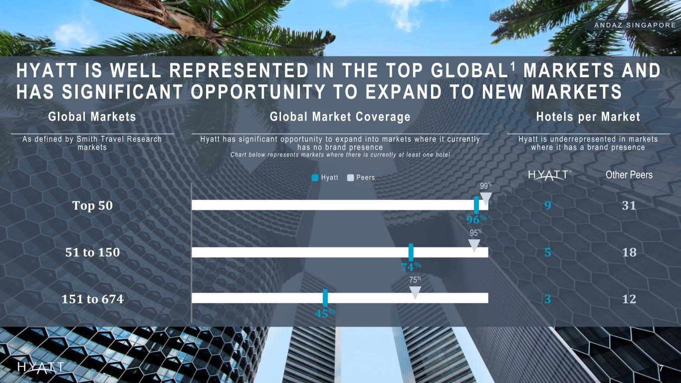 6 Hyatt focused on growing Luxury propert ies to serve high-end customers D R E A M S L A R O M A N A R E S O R T & S P A While competi tors focused on Upscale and Upper Midscale & Midscale Luxury Upper Upsca le Upsca le Upper M idsca le Midsca le 23% 33% 47% 38% 30% 27% 2% 2017 2024 Footnotes: Figures as of years ended December 31, 2017 and December 31, 2024 based on public filings for Hyatt Hotels Corporation, Hilton Worldwide Holdings Inc., and Marriott International Inc., and do not include vacation ownership, residential, condominium ownership units, or yachts. 1Chain scale classifications as defined by Smith Travel Research. Excludes brands listed as other or excluded from STR Chain Scales. 10% 9% 50% 44% 36% 40% 4% 7% 2017 2024 2% 3% 33% 29% 34% 30% 31% 35% 3% 2017 2024 FOCUSED GROWTH HAS POSITIONED HYATT AS A LEADER IN LUXURY Chain scale1 mix in 2017 and in 2024 Source Notes: Updated Annually, data to match YE 2024. Support: Hyatt Hotels\CHICO-Team-Corporate FPA - Documents\Fact Pack and QA Document\202X\Investor Consideration Deck Support\Annual\Hyatt and Comp set Inventory Summary 2017-2024 Marriott Hi l ton