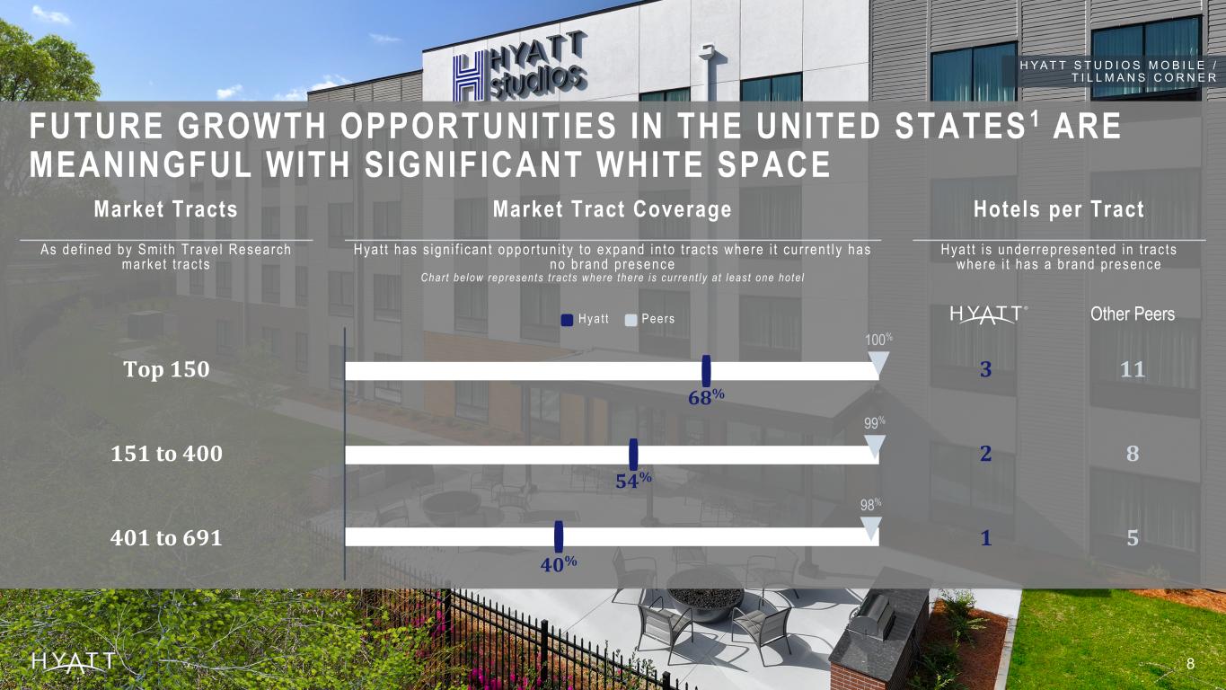 Global Markets Global Market Coverage Hotels per Market As de f ined by Smi th T rave l Research marke ts Hya t t has s ign i f i can t oppor tun i t y to expand in to marke ts where i t cu r ren t l y has no b rand p resence Char t be low represen ts marke ts where there i s cu r ren t l y a t l eas t one ho te l Hyat t i s under represen ted in marke ts where i t has a b rand p resence Hyat t Peers Other Peers Top 50 9 31 51 to 150 5 18 151 to 674 3 12 HYATT IS WELL REPRESENTED IN THE TOP GLOBAL 1 MARKETS AND HAS SIGNIFICANT OPPORTUNITY TO EXPAND TO NEW MARKETS 99% 95% 75% 96% 74% 45% Footnotes: 1 Based on Smith Travel Research Global Census as of March 31, 2025. Global market ranking determined by aggregate room count. Markets as defined by Smith Travel Research: “A geographic area normally composed of a Metropolitan Statistical Area”. Peers referenced include Hilton Worldwide Holdings Inc., Marriott International Inc., and IHG Hotels & Resorts. 7 A N D A Z S I N G A P O R E