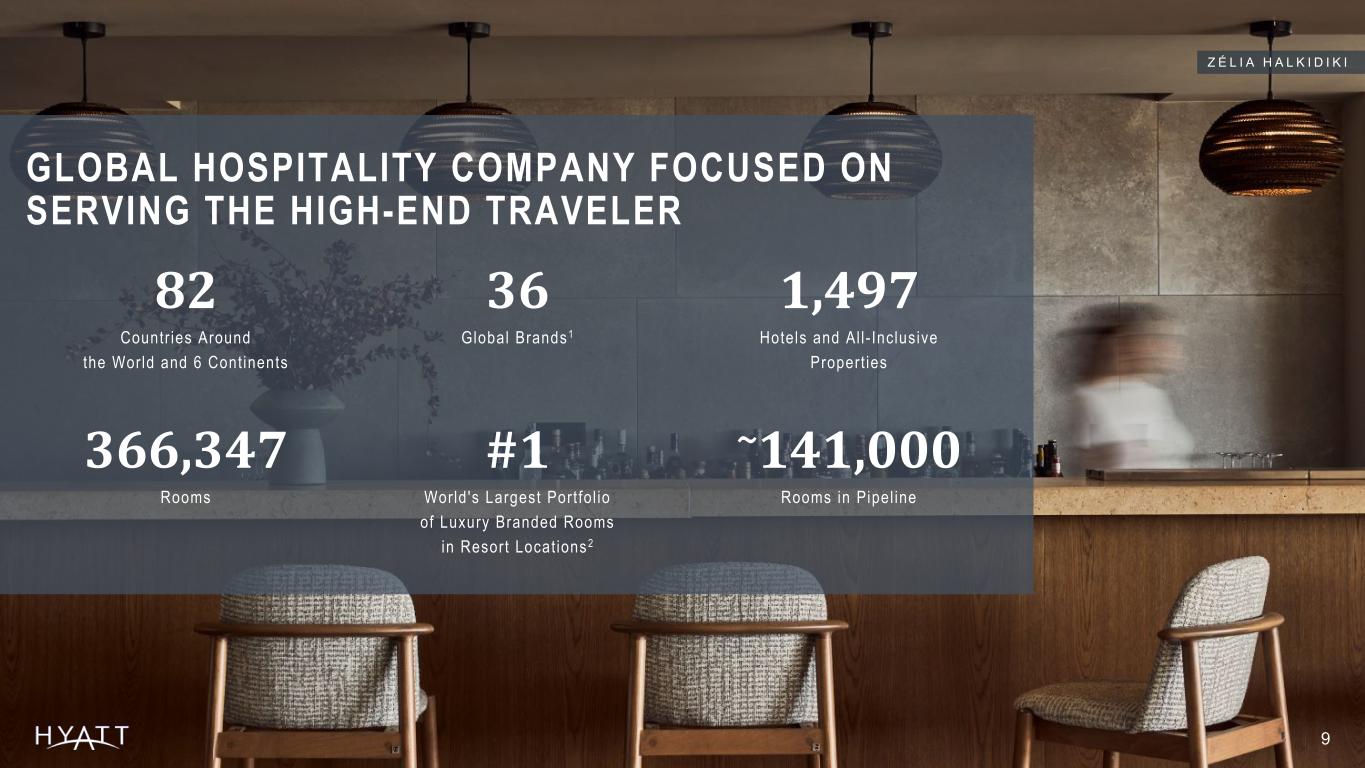 Market Tracts Market Tract Coverage Hotels per Tract As de f ined by Smi th T rave l Research marke t t rac ts Hya t t has s ign i f i can t oppor tun i t y to expand in to t rac ts where i t cu r ren t l y has no b rand p resence Char t be low represen ts t rac ts where there i s cu r ren t l y a t l eas t one ho te l Hyat t i s under represen ted in t rac ts where i t has a b rand p resence Hyat t Peers Other Peers Top 150 3 11 151 to 400 2 8 401 to 691 1 5 FUTURE GROWTH OPPORTUNITIES IN THE UNITED STATES 1 ARE MEANINGFUL WITH SIGNIFICANT WHITE SPACE 100% 99% 98% 68% 54% 40% Footnotes: 1 Based on Smith Travel Research Global Census as of March 31, 2025. Market tract ranking determined by aggregate room count. Market Tracts as defined by Smith Travel Research: “A geographic subset of a STR market”. Peers referenced include Hilton Worldwide Holdings Inc., Marriott International Inc., and IHG Hotels & Resorts. 8 H Y A T T S T U D I O S M O B I L E / T I L L M A N S C O R N E R
