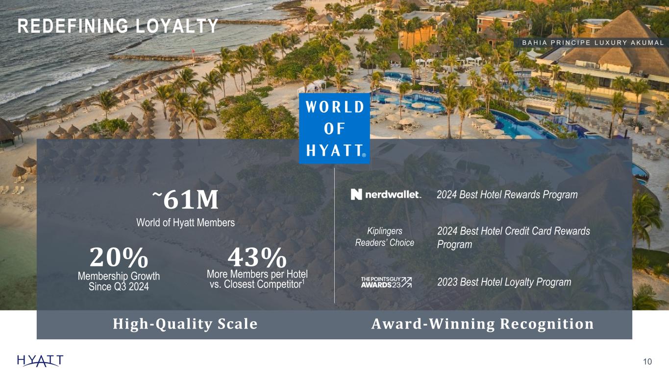 9 GLOBAL HOSPITALITY COMPANY FOCUSED ON SERVING THE HIGH-END TRAVELER 82 Countr ies Around the World and 6 Cont inents 366,347 Rooms 36 Global Brands1 1,497 Hotels and Al l - Inclusive Propert ies #1 World 's Largest Port fo l io of Luxury Branded Rooms in Resort Locat ions 2 ~141,000 Rooms in Pipel ine Source Notes: Slide Updated Quarterly Countries, Rooms, Hotel count, and Pipeline linked to ER Body and Consolidations workbook. Manually update Global brands based on Boilerplate and Ranking of Luxury branded rooms in Resort Locations. -Luxury branded rooms in Resort Locations based on STR census as of X, 2024 Colleagues at 12/31/24: 227,000 Footnotes: Figures as of September 30, 2025. 1 Global brands inclusive of September 30, 2025 brand bar and Bahia Principe Hotels & Resorts. 2 Source: Smith Travel Research Global Census as of September 30, 2025. Luxury branded rooms as defined by Smith Travel Research chain scale classification. Z É L I A H A L K I D I K I