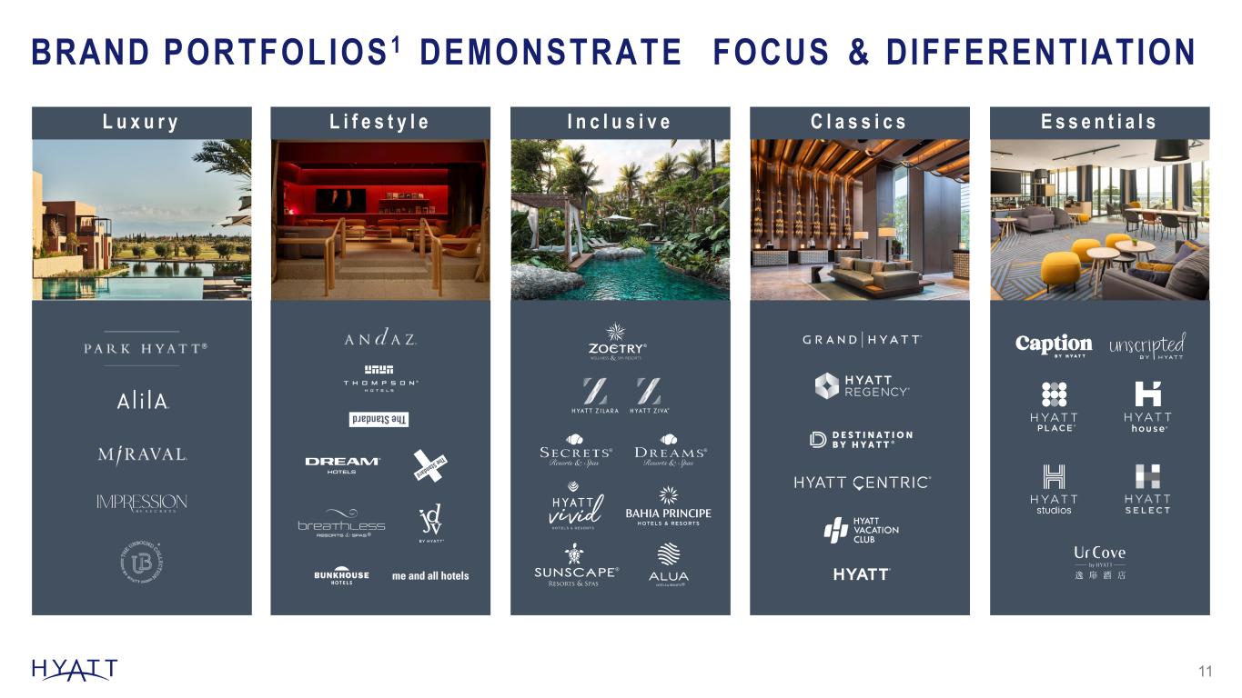 REDEFINING LOYALTY Award-Winning Recognition 10 2023 Best Hotel Loyalty Program 2024 Best Hotel Rewards Program~61M World of Hyatt Members High-Quality Scale 43% More Members per Hotel vs. Closest Competitor1 20% Membership Growth Since Q3 2024 B A H I A P R I N C I P E L U X U R Y A K U M A L Source Notes: Members per Hotel stat updated semi-annually (6/30 and 12/31) based on filings for IHG, MAR, and HLT World of Hyatt Membership updated quarterly based on WOH enrollments file Footnotes: World of Hyatt membership as of September 30, 2025, and growth rates represent year-over-year comparisons from quarters ended September 30, 2024 and September 30, 2025. 1 Members per hotel figures calculated based on public filings as of June 30, 2025. 2024 Best Hotel Credit Card Rewards Program Kiplingers Readers’ Choice
