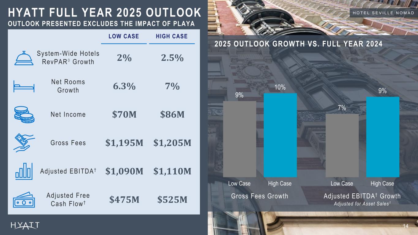ADJUSTED EBITDA† DILUTED EPS GROSS FEES $(49)M NET INCOME (LOSS) $(0.51) $291M $283M OPERATIONAL RESULTS FINANCIAL RESULTS +4.4% PIPEL INE ROOMS GROWTH +12.1% NET ROOMS GROWTH 7 . 0 % N R G E X C L U D I N G A C Q U I S I T I O N S +0.3% SYSTEM-WIDE HOTELS REVPAR ◊ GROWTH +20% WORLD OF HYATT MEMBER GROWTH ~6 1 M | N E W R E C O R D Source Notes: Operational Results: RevPAR and NRG are linked to ER. Pipeline increase should be calculated vs prior year’s ER (rounded pipeline) vs current year rounded pipeline #. World of Hyatt Member growth: Teams\Hyatt Hotels\CHICO-Team- Corporate FPA - Documents\Hotel FP&A\World of Hyatt Enrollments Reported Pipeline: – 2023 YE: 127K – 2024 YE: 138K – 2024 Q1: 129K 13 Q3 2025 HIGHLIGHTS1 Footnotes: 1 Figures as of September 30, 2025, and growth rates represent year-over-year comparisons from quarters ended September 30, 2024 and September 30, 2025. H Y A T T R E G E N C Y Z A D A R R E C E N T L Y O P E N E D I N Q 2 2 0 2 5