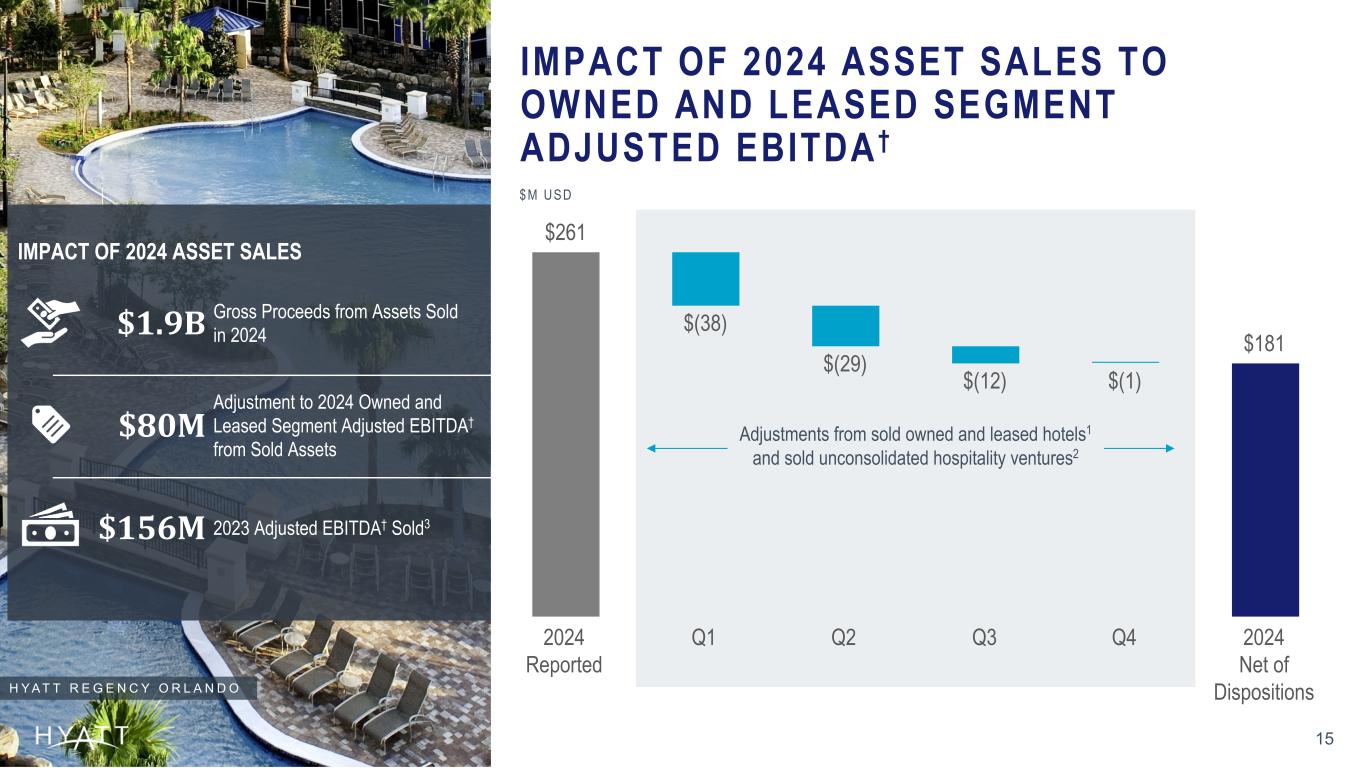 9% 10% Low Case High Case 14 H O T E L S E V I L L E N O M A DHYATT FULL YEAR 2025 OUTLOOK OUTLOOK PRESENTED EXCLUDES THE IMPACT OF PLAYA 2025 OUTLOOK GROWTH VS. FULL YEAR 2024 LOW CASE HIGH CASE System-Wide Hote ls RevPAR◊ Growth 2% 2.5% Net Rooms Growth 6.3% 7% Net Income $70M $86M Gross Fees $1,195M $1,205M Adjusted EBITDA † $1,090M $1,110M Adjusted Free Cash Flow † $475M $525M Footnotes: 1 Reflects a reduction of $80 million to 2024 owned and leased segment Adjusted EBITDA† to account for the impact of sold hotels. Refer to schedule A-10 in the third quarter 2025 earnings release for additional detail on the adjustments to owned and leased segment Adjusted EBITDA† from sold assets. Full details of the Company’s 2025 outlook can be found in its third quarter 2025 earnings release. The Company’s 2025 outlook is based on a number of assumptions that are subject to change and many of which are outside the control of the Company. If actual results vary from these assumptions, the Company's expectations may change. There can be no assurance that the Company will achieve these results. Other than with respect to the Playa Hotels Acquisition, no disposition or acquisition activity beyond what has been completed as of the date of this release has been included in the 2025 Outlook. Gross Fees Growth Adjusted EBITDA† Growth Adjusted for Asset Sales1 7% 9% Low Case High Case