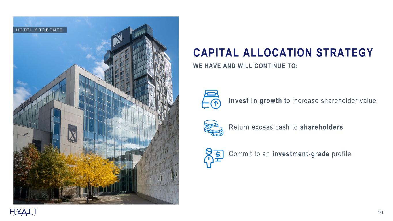 IMPACT OF 2024 ASSET SALES TO OWNED AND LEASED SEGMENT ADJUSTED EBITDA † 15 IMPACT OF 2024 ASSET SALES $1.9B Gross Proceeds from Assets Sold in 2024 $80M Adjustment to 2024 Owned and Leased Segment Adjusted EBITDA† from Sold Assets $156M 2023 Adjusted EBITDA† Sold3 Source Notes: Updated at YE, based on ER schedule Adjustments from sold owned and leased hotels1 and sold unconsolidated hospitality ventures2 Footnotes: Additional details relating to the adjustments to owned and leased segment adjusted EBITDA† from sold assets can be found on schedule A-9 of the third quarter 2025 earnings release. 1 Adjustment from sold owned and leased hotels represents the Adjusted EBITDA† contribution in each period for hotels that have been sold as of September 30, 2025 and for which the Company entered into long-term management or franchise agreements; excludes gross fees retained following the sale. Hotels that have been sold include Hyatt Regency Aruba Resort Spa and Casino (1Q24), Park Hyatt Zurich (2Q24), Hyatt Regency San Antonio Riverwalk (2Q24), Hyatt Regency Green Bay (2Q24), Hyatt Regency Orlando (3Q24), and Hyatt Regency O'Hare Chicago (4Q24). 2 Adjustment from sold unconsolidated hospitality ventures represents Hyatt's pro rata share of unconsolidated hospitality ventures' Adjusted EBITDA† contribution in each period for unconsolidated hospitality ventures that have been sold (Park Hyatt Los Cabos at Cabo Del Sol hotel and residences (4Q24) and Hyatt Centric Downtown Nashville (4Q24)) or where our ownership has been diluted for our unconsolidated hospitality venture as of December 31, 2024. 3 Represents the 2023 Adjusted EBITDA† contribution from owned and leased hotels sold in 2023 and 2024, whereby the Company entered into long-term management or franchise agreements excluding gross fees retained following the sale, and the pro rata share of unconsolidated hospitality ventures' 2023 Adjusted EBITDA† contribution from unconsolidated hospitality ventures sold in 2023 and 2024. H Y A T T R E G E N C Y O R L A N D O $M USD 15 $261 $(38) $(29) $(12) $(1) $181 2024 Reported Q1 Q2 Q3 Q4 2024 Net of Dispositions