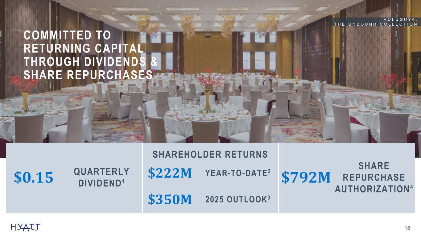 HYATT (EX. PLAYA) EARNINGS GROWTH MODEL REFLECTS SIMPLIFIED AND MORE PREDICTABLE EARNINGS 17 EARNINGS GROWTH MODEL SENSITIVITIES FOR 2025, EXCLUDES PLAYA IMPACT System-Wide Hotels RevPAR◊ Growth1 Addi t iona l Mode l Assumpt ions 2025 Earnings Mix Outlook before Overhead Asset-Light Earnings Mix◊ +100bps 2026 & beyond Managemen t and F ranch i s i ng 75% Asse t -L igh t Ea rn ings M ix ◊ Dis t r i bu t i on 10% Asse t -L igh t Ea rn ings M ix ◊ Owned and Leased 15% Net Rooms Growth $10M – $18M $8M – $10M Distribution Margins Overhead Growth 14% -17%3% per year Source Notes: Footnotes: 1 System-wide hotels RevPAR◊ growth includes comparable hotels. The Company's outlook for 2025 is based on a number of assumptions that are subject to change and many of which are outside the control of the Company. If actual results vary from these assumptions, the Company's expectations may change. There can be no assurance that the Company will achieve these results. 1.0% – 1.8% 0.8% – 1.0% ADJUSTED EBITDA Adjusted EBITDA growth after adjust ing for 2024 asset sales ADJ. EBITDA GROWTH + / - 1 POINT