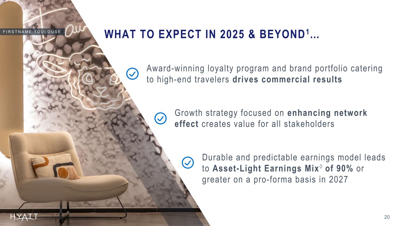 COMMITTED TO INVESTMENT GRADE 19 Credit Ratings BBB- Stab le BBB- Stab le Baa3 Stab le Liquidi ty $0.7B Cash and Cash Equ iva len ts , & Shor t -Term Inves tments $1.5B Revo lver Capac i ty Ava i lab le , Net o f Le t te rs o f Cred i t Outs tand ing STRONG POSIT ION WITH: A L U A S O U L S U N N Y B E A C H $— $400 $600 $899 $600 $1,740 2025 2026 2027 2028 2029 2030 & Beyond Source Notes: Footnotes: Total debt and liquidity figures as of September 30, 2025. 1 Chart excludes $59 million of variable rate mortgage loan, $51 million of variable rate term loan, $20 million of floating average rate loan, $22 million of finance lease obligations, $36 million of unamortized discounts and deferred financing fees as well as Hyatt’s revolving credit facility. At September 30, 2025, the Company had $1,497 million million of borrowing capacity available under our revolving credit facility, net of letters of credit outstanding. On October 30, 2025 Hyatt executed a new credit agreement for $1.5 billion which will expire in 2030. 2 The Company repaid the outstanding balance on the $450 million of 5.375% senior notes due 2025 at maturity during the nine months ended September 30, 2025. Total Debt: $6.0B , Inclusive of $1.7 bi l l ion Delayed Draw Term Loan Senior Notes Maturities by Year1 Total Senior Notes: $4.2B $M USD 2 The Company used the $1 .7 b i l l i on de layed draw te rm loan fac i l i t y to fund a por t ion o f the P laya Hote ls Acqu is i t ion and is requ i red to repay the loan fac i l i t y w i th p roceeds f rom the P laya Rea l Es ta te Transac t ion . The Company expec ts to c lose on the P laya Rea l Es ta te Transac t ion be fore the end o f the year .