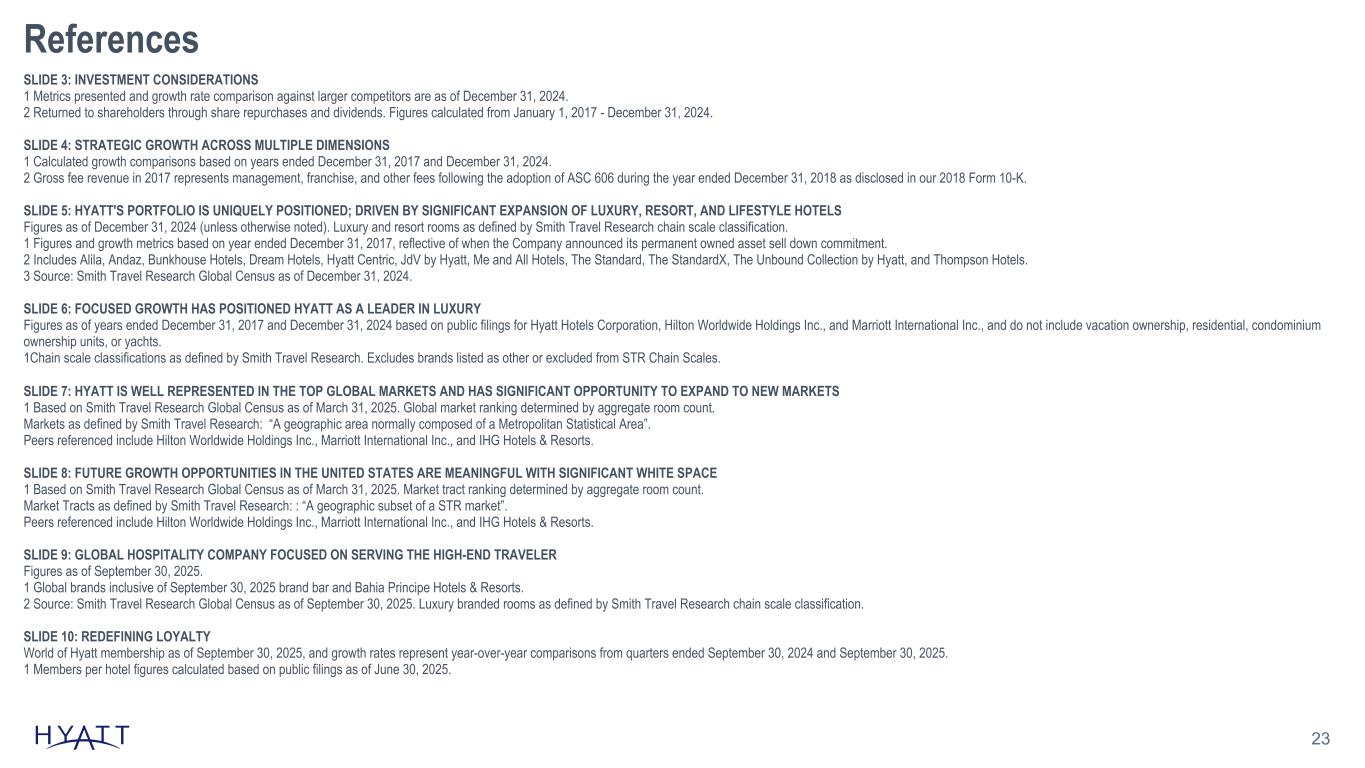 23 References SLIDE 3: INVESTMENT CONSIDERATIONS 1 Metrics presented and growth rate comparison against larger competitors are as of December 31, 2024. 2 Returned to shareholders through share repurchases and dividends. Figures calculated from January 1, 2017 - December 31, 2024. SLIDE 4: STRATEGIC GROWTH ACROSS MULTIPLE DIMENSIONS 1 Calculated growth comparisons based on years ended December 31, 2017 and December 31, 2024. 2 Gross fee revenue in 2017 represents management, franchise, and other fees following the adoption of ASC 606 during the year ended December 31, 2018 as disclosed in our 2018 Form 10-K. SLIDE 5: HYATT'S PORTFOLIO IS UNIQUELY POSITIONED; DRIVEN BY SIGNIFICANT EXPANSION OF LUXURY, RESORT, AND LIFESTYLE HOTELS Figures as of December 31, 2024 (unless otherwise noted). Luxury and resort rooms as defined by Smith Travel Research chain scale classification. 1 Figures and growth metrics based on year ended December 31, 2017, reflective of when the Company announced its permanent owned asset sell down commitment. 2 Includes Alila, Andaz, Bunkhouse Hotels, Dream Hotels, Hyatt Centric, JdV by Hyatt, Me and All Hotels, The Standard, The StandardX, The Unbound Collection by Hyatt, and Thompson Hotels. 3 Source: Smith Travel Research Global Census as of December 31, 2024. SLIDE 6: FOCUSED GROWTH HAS POSITIONED HYATT AS A LEADER IN LUXURY Figures as of years ended December 31, 2017 and December 31, 2024 based on public filings for Hyatt Hotels Corporation, Hilton Worldwide Holdings Inc., and Marriott International Inc., and do not include vacation ownership, residential, condominium ownership units, or yachts. 1Chain scale classifications as defined by Smith Travel Research. Excludes brands listed as other or excluded from STR Chain Scales. SLIDE 7: HYATT IS WELL REPRESENTED IN THE TOP GLOBAL MARKETS AND HAS SIGNIFICANT OPPORTUNITY TO EXPAND TO NEW MARKETS 1 Based on Smith Travel Research Global Census as of March 31, 2025. Global market ranking determined by aggregate room count. Markets as defined by Smith Travel Research: “A geographic area normally composed of a Metropolitan Statistical Area”. Peers referenced include Hilton Worldwide Holdings Inc., Marriott International Inc., and IHG Hotels & Resorts. SLIDE 8: FUTURE GROWTH OPPORTUNITIES IN THE UNITED STATES ARE MEANINGFUL WITH SIGNIFICANT WHITE SPACE 1 Based on Smith Travel Research Global Census as of March 31, 2025. Market tract ranking determined by aggregate room count. Market Tracts as defined by Smith Travel Research: : “A geographic subset of a STR market”. Peers referenced include Hilton Worldwide Holdings Inc., Marriott International Inc., and IHG Hotels & Resorts. SLIDE 9: GLOBAL HOSPITALITY COMPANY FOCUSED ON SERVING THE HIGH-END TRAVELER Figures as of September 30, 2025. 1 Global brands inclusive of September 30, 2025 brand bar and Bahia Principe Hotels & Resorts. 2 Source: Smith Travel Research Global Census as of September 30, 2025. Luxury branded rooms as defined by Smith Travel Research chain scale classification. SLIDE 10: REDEFINING LOYALTY World of Hyatt membership as of September 30, 2025, and growth rates represent year-over-year comparisons from quarters ended September 30, 2024 and September 30, 2025. 1 Members per hotel figures calculated based on public filings as of June 30, 2025.