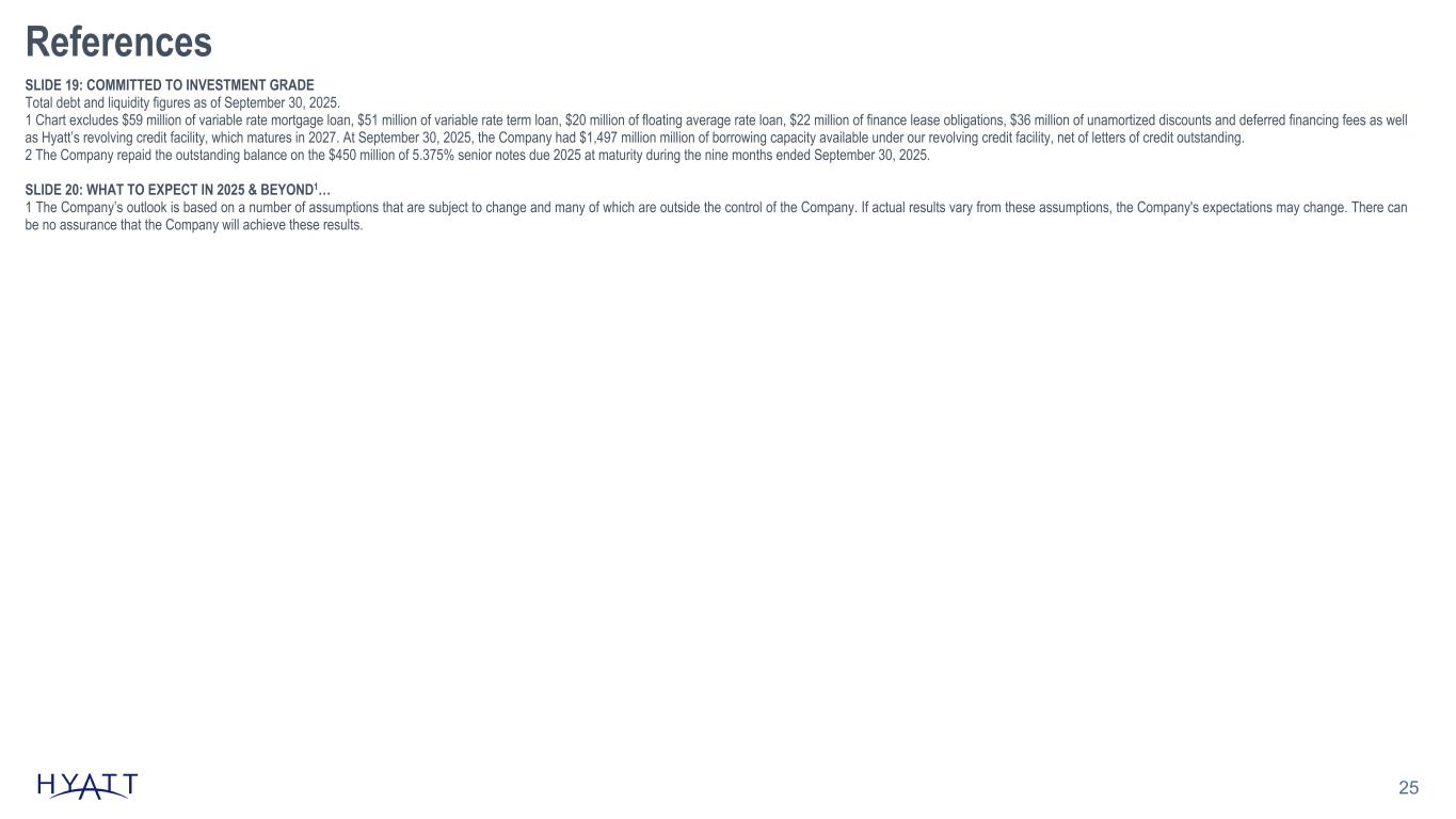 25 References SLIDE 19: COMMITTED TO INVESTMENT GRADE Total debt and liquidity figures as of September 30, 2025. 1 Chart excludes $59 million of variable rate mortgage loan, $51 million of variable rate term loan, $20 million of floating average rate loan, $22 million of finance lease obligations, $36 million of unamortized discounts and deferred financing fees as well as Hyatt’s revolving credit facility, which matures in 2027. At September 30, 2025, the Company had $1,497 million million of borrowing capacity available under our revolving credit facility, net of letters of credit outstanding. 2 The Company repaid the outstanding balance on the $450 million of 5.375% senior notes due 2025 at maturity during the nine months ended September 30, 2025. SLIDE 20: WHAT TO EXPECT IN 2025 & BEYOND1… 1 The Company’s outlook is based on a number of assumptions that are subject to change and many of which are outside the control of the Company. If actual results vary from these assumptions, the Company's expectations may change. There can be no assurance that the Company will achieve these results.
