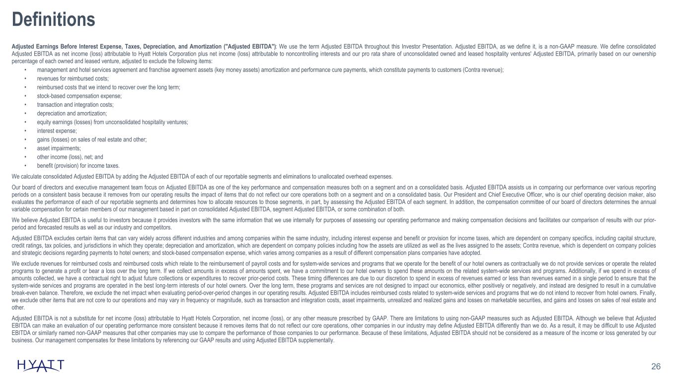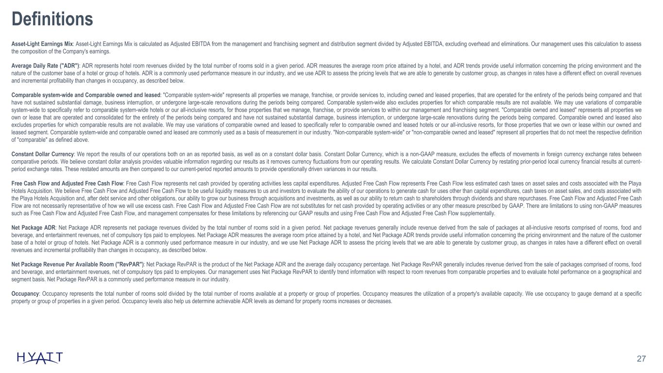 26 Definitions Adjusted Earnings Before Interest Expense, Taxes, Depreciation, and Amortization ("Adjusted EBITDA"): We use the term Adjusted EBITDA throughout this Investor Presentation. Adjusted EBITDA, as we define it, is a non-GAAP measure. We define consolidated Adjusted EBITDA as net income (loss) attributable to Hyatt Hotels Corporation plus net income (loss) attributable to noncontrolling interests and our pro rata share of unconsolidated owned and leased hospitality ventures' Adjusted EBITDA, primarily based on our ownership percentage of each owned and leased venture, adjusted to exclude the following items: • management and hotel services agreement and franchise agreement assets (key money assets) amortization and performance cure payments, which constitute payments to customers (Contra revenue); • revenues for reimbursed costs; • reimbursed costs that we intend to recover over the long term; • stock-based compensation expense; • transaction and integration costs; • depreciation and amortization; • equity earnings (losses) from unconsolidated hospitality ventures; • interest expense; • gains (losses) on sales of real estate and other; • asset impairments; • other income (loss), net; and • benefit (provision) for income taxes. We calculate consolidated Adjusted EBITDA by adding the Adjusted EBITDA of each of our reportable segments and eliminations to unallocated overhead expenses. Our board of directors and executive management team focus on Adjusted EBITDA as one of the key performance and compensation measures both on a segment and on a consolidated basis. Adjusted EBITDA assists us in comparing our performance over various reporting periods on a consistent basis because it removes from our operating results the impact of items that do not reflect our core operations both on a segment and on a consolidated basis. Our President and Chief Executive Officer, who is our chief operating decision maker, also evaluates the performance of each of our reportable segments and determines how to allocate resources to those segments, in part, by assessing the Adjusted EBITDA of each segment. In addition, the compensation committee of our board of directors determines the annual variable compensation for certain members of our management based in part on consolidated Adjusted EBITDA, segment Adjusted EBITDA, or some combination of both. We believe Adjusted EBITDA is useful to investors because it provides investors with the same information that we use internally for purposes of assessing our operating performance and making compensation decisions and facilitates our comparison of results with our prior- period and forecasted results as well as our industry and competitors. Adjusted EBITDA excludes certain items that can vary widely across different industries and among companies within the same industry, including interest expense and benefit or provision for income taxes, which are dependent on company specifics, including capital structure, credit ratings, tax policies, and jurisdictions in which they operate; depreciation and amortization, which are dependent on company policies including how the assets are utilized as well as the lives assigned to the assets; Contra revenue, which is dependent on company policies and strategic decisions regarding payments to hotel owners; and stock-based compensation expense, which varies among companies as a result of different compensation plans companies have adopted. We exclude revenues for reimbursed costs and reimbursed costs which relate to the reimbursement of payroll costs and for system-wide services and programs that we operate for the benefit of our hotel owners as contractually we do not provide services or operate the related programs to generate a profit or bear a loss over the long term. If we collect amounts in excess of amounts spent, we have a commitment to our hotel owners to spend these amounts on the related system-wide services and programs. Additionally, if we spend in excess of amounts collected, we have a contractual right to adjust future collections or expenditures to recover prior-period costs. These timing differences are due to our discretion to spend in excess of revenues earned or less than revenues earned in a single period to ensure that the system-wide services and programs are operated in the best long-term interests of our hotel owners. Over the long term, these programs and services are not designed to impact our economics, either positively or negatively, and instead are designed to result in a cumulative break-even balance. Therefore, we exclude the net impact when evaluating period-over-period changes in our operating results. Adjusted EBITDA includes reimbursed costs related to system-wide services and programs that we do not intend to recover from hotel owners. Finally, we exclude other items that are not core to our operations and may vary in frequency or magnitude, such as transaction and integration costs, asset impairments, unrealized and realized gains and losses on marketable securities, and gains and losses on sales of real estate and other. Adjusted EBITDA is not a substitute for net income (loss) attributable to Hyatt Hotels Corporation, net income (loss), or any other measure prescribed by GAAP. There are limitations to using non-GAAP measures such as Adjusted EBITDA. Although we believe that Adjusted EBITDA can make an evaluation of our operating performance more consistent because it removes items that do not reflect our core operations, other companies in our industry may define Adjusted EBITDA differently than we do. As a result, it may be difficult to use Adjusted EBITDA or similarly named non-GAAP measures that other companies may use to compare the performance of those companies to our performance. Because of these limitations, Adjusted EBITDA should not be considered as a measure of the income or loss generated by our business. Our management compensates for these l