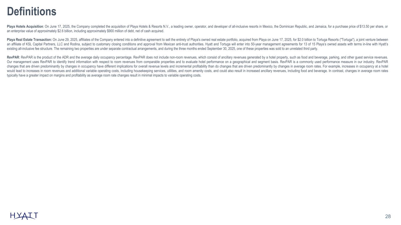 28 Definitions Playa Hotels Acquisition: On June 17, 2025, the Company completed the acquisition of Playa Hotels & Resorts N.V., a leading owner, operator, and developer of all-inclusive resorts in Mexico, the Dominican Republic, and Jamaica, for a purchase price of $13.50 per share, or an enterprise value of approximately $2.6 billion, including approximately $900 million of debt, net of cash acquired. Playa Real Estate Transaction: On June 29, 2025, affiliates of the Company entered into a definitive agreement to sell the entirely of Playa's owned real estate portfolio, acquired from Playa on June 17, 2025, for $2.0 billion to Tortuga Resorts ("Tortuga"), a joint venture between an affiliate of KSL Capital Partners, LLC and Rodina, subject to customary closing conditions and approval from Mexican anti-trust authorities. Hyatt and Tortuga will enter into 50-year management agreements for 13 of 15 Playa’s owned assets with terms in-line with Hyatt’s existing all-inclusive fee structure. The remaining two properties are under separate contractual arrangements, and during the three months ended September 30, 2025, one of these properties was sold to an unrelated third party. RevPAR: RevPAR is the product of the ADR and the average daily occupancy percentage. RevPAR does not include non-room revenues, which consist of ancillary revenues generated by a hotel property, such as food and beverage, parking, and other guest service revenues. Our management uses RevPAR to identify trend information with respect to room revenues from comparable properties and to evaluate hotel performance on a geographical and segment basis. RevPAR is a commonly used performance measure in our industry. RevPAR changes that are driven predominantly by changes in occupancy have different implications for overall revenue levels and incremental profitability than do changes that are driven predominantly by changes in average room rates. For example, increases in occupancy at a hotel would lead to increases in room revenues and additional variable operating costs, including housekeeping services, utilities, and room amenity costs, and could also result in increased ancillary revenues, including food and beverage. In contrast, changes in average room rates typically have a greater impact on margins and profitability as average room rate changes result in minimal impacts to variable operating costs.