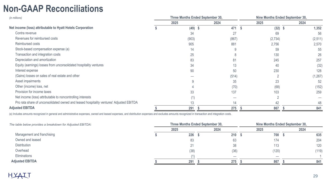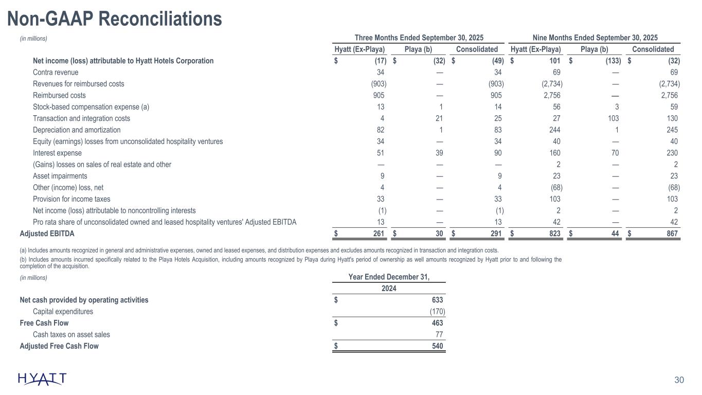 Non-GAAP Reconciliations 29 (in millions) Three Months Ended September 30, Nine Months Ended September 30, 2025 2024 2025 2024 Net income (loss) attributable to Hyatt Hotels Corporation $ (49) $ 471 $ (32) $ 1,352 Contra revenue 34 27 69 56 Revenues for reimbursed costs (903) (867) (2,734) (2,511) Reimbursed costs 905 881 2,756 2,570 Stock-based compensation expense (a) 14 9 59 55 Transaction and integration costs 25 8 130 26 Depreciation and amortization 83 81 245 257 Equity (earnings) losses from unconsolidated hospitality ventures 34 13 40 (32) Interest expense 90 50 230 128 (Gains) losses on sales of real estate and other — (514) 2 (1,267) Asset impairments 9 35 23 52 Other (income) loss, net 4 (70) (68) (152) Provision for income taxes 33 137 103 259 Net income (loss) attributable to noncontrolling interests (1) — 2 — Pro rata share of unconsolidated owned and leased hospitality ventures' Adjusted EBITDA 13 14 42 48 Adjusted EBITDA $ 291 $ 275 $ 867 $ 841 (a) Includes amounts recognized in general and administrative expenses, owned and leased expenses, and distribution expenses and excludes amounts recognized in transaction and integration costs. The table below provides a breakdown for Adjusted EBITDA: Three Months Ended September 30, Nine Months Ended September 30, 2025 2024 2025 2024 Management and franchising $ 226 $ 210 $ 700 $ 635 Owned and leased 83 63 174 204 Distribution 21 38 113 120 Overhead (38) (36) (120) (119) Eliminations (1) — — 1 Adjusted EBITDA $ 291 $ 275 $ 867 $ 841 Source Notes: linked to ER schedule
