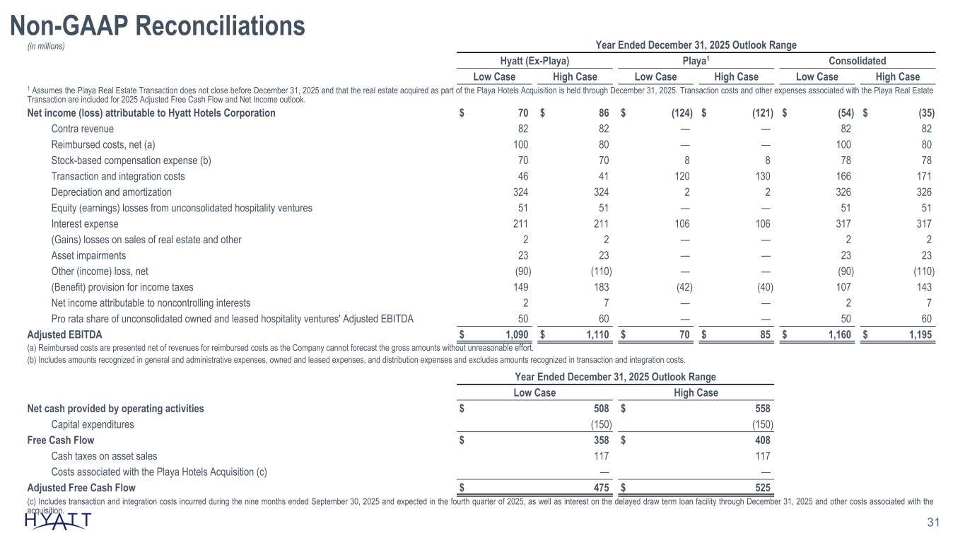 Non-GAAP Reconciliations 30 (in millions) Three Months Ended September 30, 2025 Nine Months Ended September 30, 2025 Hyatt (Ex-Playa) Playa (b) Consolidated Hyatt (Ex-Playa) Playa (b) Consolidated Net income (loss) attributable to Hyatt Hotels Corporation $ (17) $ (32) $ (49) $ 101 $ (133) $ (32) Contra revenue 34 — 34 69 — 69 Revenues for reimbursed costs (903) — (903) (2,734) — (2,734) Reimbursed costs 905 — 905 2,756 — 2,756 Stock-based compensation expense (a) 13 1 14 56 3 59 Transaction and integration costs 4 21 25 27 103 130 Depreciation and amortization 82 1 83 244 1 245 Equity (earnings) losses from unconsolidated hospitality ventures 34 — 34 40 — 40 Interest expense 51 39 90 160 70 230 (Gains) losses on sales of real estate and other — — — 2 — 2 Asset impairments 9 — 9 23 — 23 Other (income) loss, net 4 — 4 (68) — (68) Provision for income taxes 33 — 33 103 — 103 Net income (loss) attributable to noncontrolling interests (1) — (1) 2 — 2 Pro rata share of unconsolidated owned and leased hospitality ventures' Adjusted EBITDA 13 — 13 42 — 42 Adjusted EBITDA $ 261 $ 30 $ 291 $ 823 $ 44 $ 867 (a) Includes amounts recognized in general and administrative expenses, owned and leased expenses, and distribution expenses and excludes amounts recognized in transaction and integration costs. (b) Includes amounts incurred specifically related to the Playa Hotels Acquisition, including amounts recognized by Playa during Hyatt's period of ownership as well amounts recognized by Hyatt prior to and following the completion of the acquisition. (in millions) Year Ended December 31, 2024 Net cash provided by operating activities $ 633 Capital expenditures (170) Free Cash Flow $ 463 Cash taxes on asset sales 77 Adjusted Free Cash Flow $ 540 Source Notes: linked to ER schedule