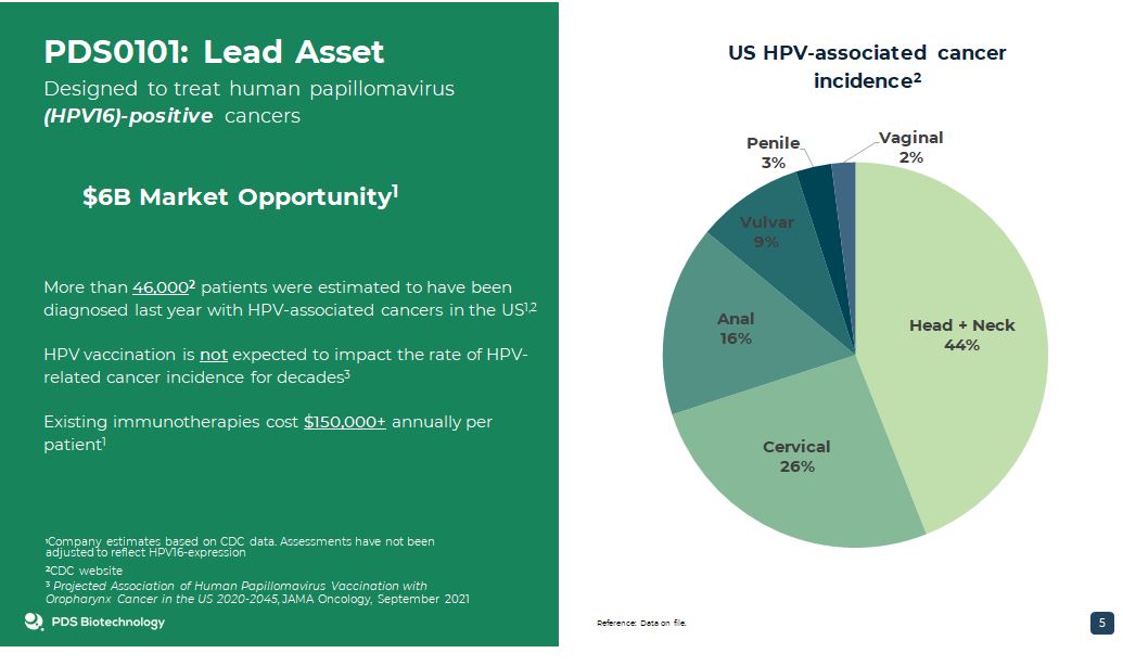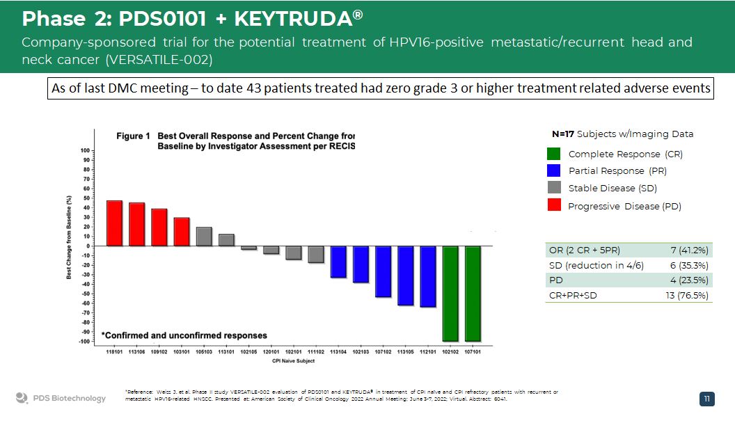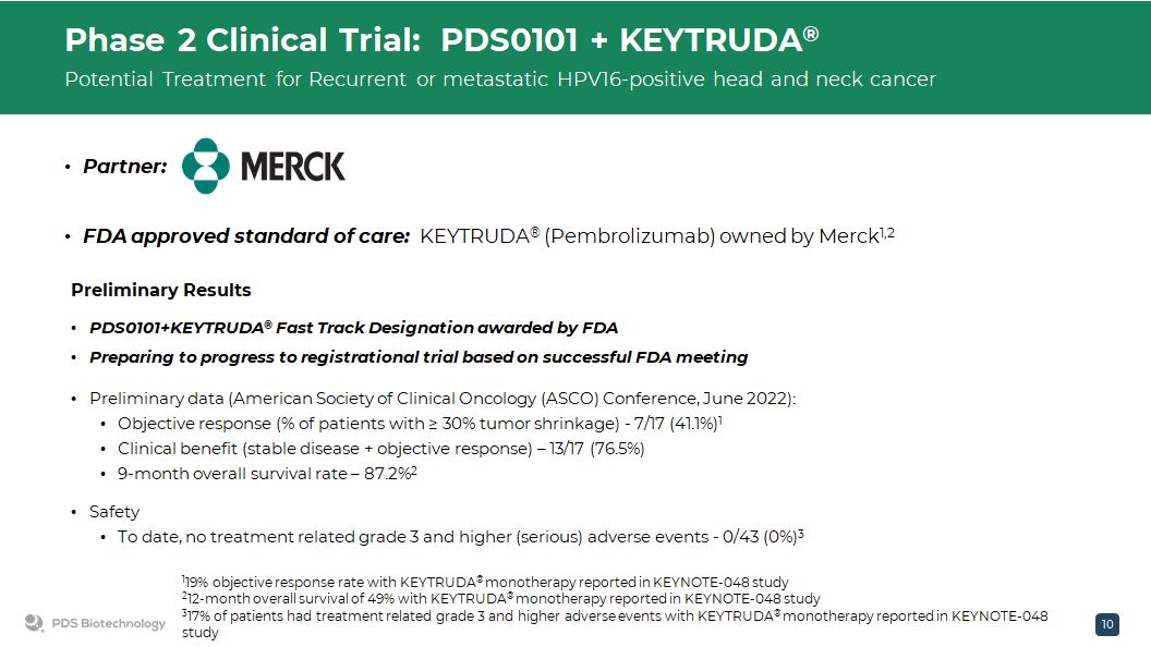 Potential Treatment for Recurrent or metastatic HPV16-positive head and neck cancer  Phase 2 Clinical Trial: PDS0101 + KEYTRUDA®  119% objective response rate with KEYTRUDA® monotherapy reported in KEYNOTE-048 study  212-month overall survival of 49% with KEYTRUDA® monotherapy reported in KEYNOTE-048 study   317% of patients had treatment related grade 3 and higher adverse events with KEYTRUDA® monotherapy reported in KEYNOTE-048 study  10  Partner:   FDA approved standard of care: KEYTRUDA® (Pembrolizumab) owned by Merck1,2  Preliminary Results  PDS0101+KEYTRUDA® Fast Track Designation awarded by FDA  Preparing to progress to registrational trial based on successful FDA meeting  Preliminary data (American Society of Clinical Oncology (ASCO) Conference, June 2022):   Objective response (% of patients with ≥ 30% tumor shrinkage) - 7/17 (41.1%)1  Clinical benefit (stable disease + objective response) – 13/17 (76.5%)  9-month overall survival rate – 87.2%2  Safety   To date, no treatment related grade 3 and higher (serious) adverse events - 0/43 (0%)3