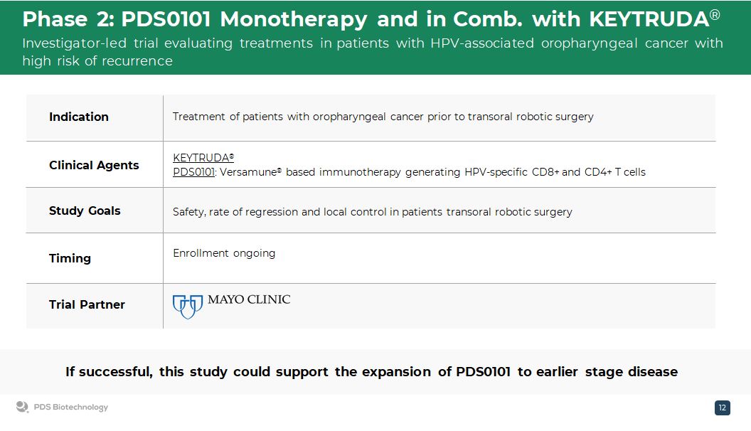 KEYTRUDA®  PDS0101: Versamune® based immunotherapy generating HPV-specific CD8+ and CD4+ T cells  3  Phase 2: PDS0101 Monotherapy and in Comb. with KEYTRUDA®  Investigator-led trial evaluating treatments in patients with HPV-associated oropharyngeal cancer with high risk of recurrence  Timing  Enrollment ongoing  Indication  Treatment of patients with oropharyngeal cancer prior to transoral robotic surgery  Clinical Agents  Study Goals  Safety, rate of regression and local control in patients transoral robotic surgery  Trial Partner  If successful, this study could support the expansion of PDS0101 to earlier stage disease   12