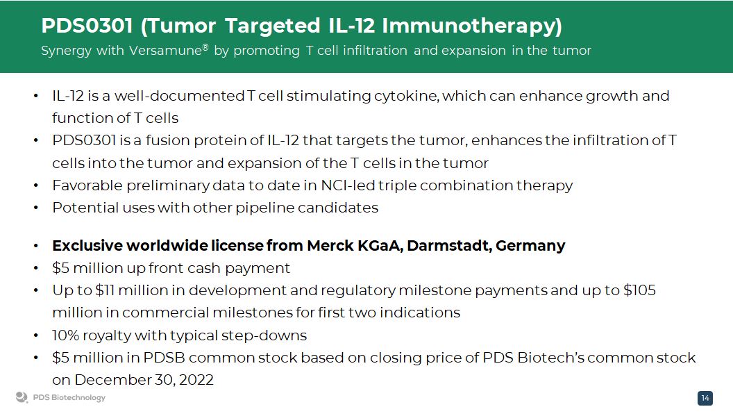 Synergy with Versamune® by promoting T cell infiltration and expansion in the tumor  PDS0301 (Tumor Targeted IL-12 Immunotherapy)  14  IL-12 is a well-documented T cell stimulating cytokine, which can enhance growth and function of T cells  PDS0301 is a fusion protein of IL-12 that targets the tumor, enhances the infiltration of T cells into the tumor and expansion of the T cells in the tumor  Favorable preliminary data to date in NCI-led triple combination therapy   Potential uses with other pipeline candidates  Exclusive worldwide license from Merck KGaA, Darmstadt, Germany  $5 million up front cash payment  Up to $11 million in development and regulatory milestone payments and up to $105 million in commercial milestones for first two indications  10% royalty with typical step-downs  $5 million in PDSB common stock based on closing price of PDS Biotech’s common stock on December 30, 2022