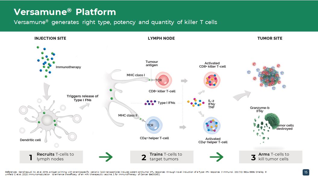 References: Gandhapudi SK, et al. 2019. Antigen priming with enantiospecific cationic lipid nanoparticles induces potent antitumor CTL responses through novel induction of a Type I IFN response. J Immunol. 202 (12): 3524-3536. Smalley R  umfield C et al. 2020. Immunomodulation to enhance the efficacy of an HPV therapeutic vaccine. J. for ImmunoTherapy of Cancer 8:e000612.  Versamune® Platform  Versamune® generates right type, potency and quantity of killer T cells  15