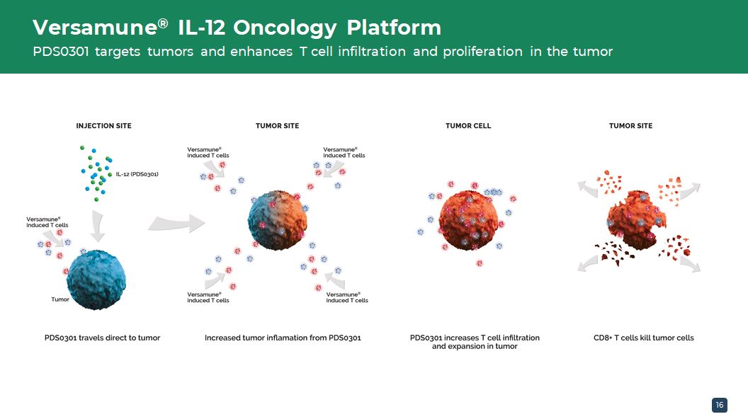 Versamune® IL-12 Oncology Platform  PDS0301 targets tumors and enhances T cell infiltration and proliferation in the tumor  16