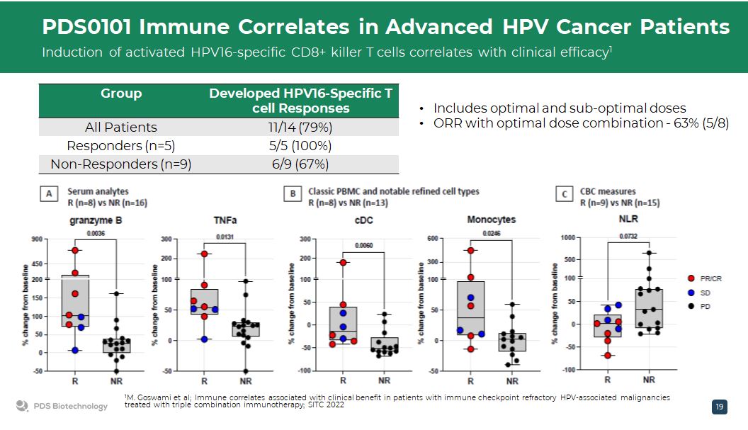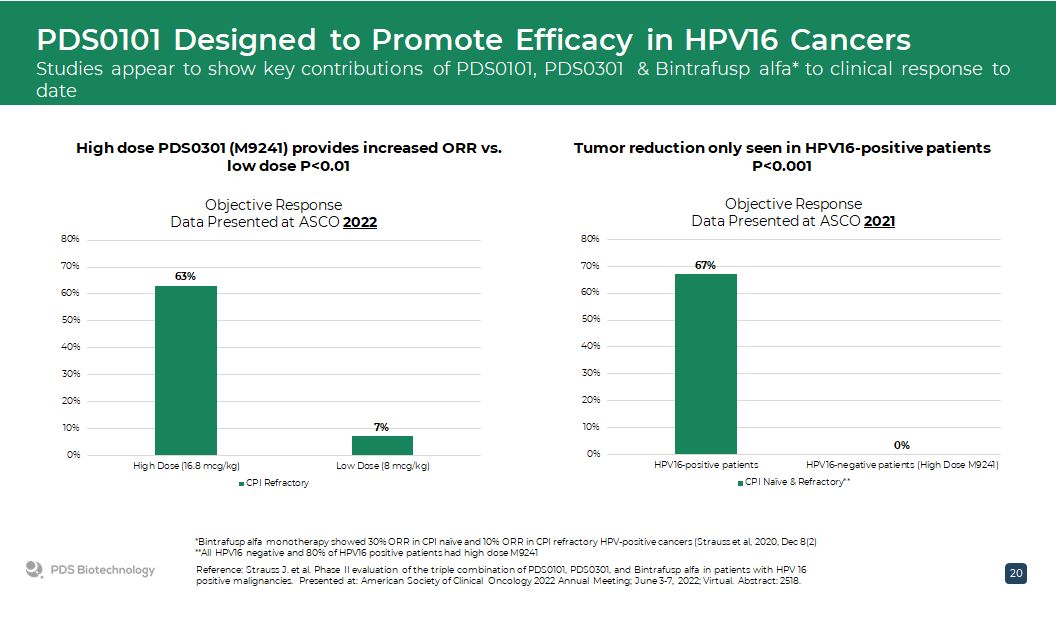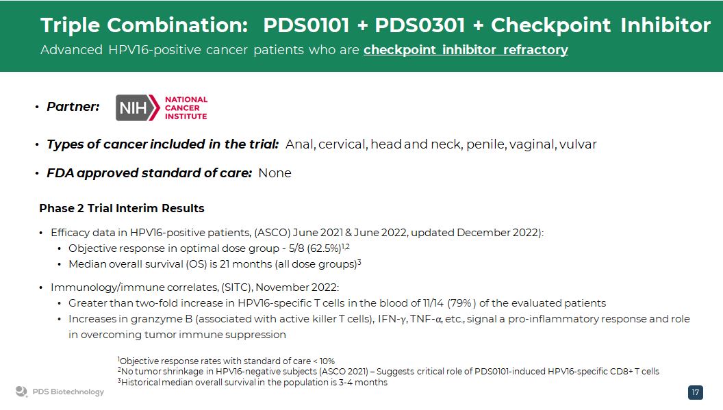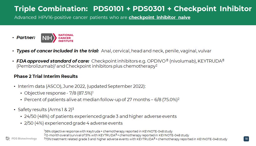 136% objective response with Keytruda + chemotherapy reported in KEYNOTE-048 study  212-month overall survival of 51% with KEYTRUDA® + chemotherapy reported in KEYNOTE-048 study  373% treatment related grade 3 and higher adverse events with KEYTRUDA® + chemotherapy reported in KEYNOTE-048 study  18  Partner:   Types of cancer included in the trial: Anal, cervical, head and neck, penile, vaginal, vulvar  FDA approved standard of care: Checkpoint inhibitors e.g. OPDIVO ® (nivolumab), KEYTRUDA® (Pembrolizumab)1 and Checkpoint inhibitors plus chemotherapy2  Phase 2 Trial Interim Results  Preliminary data (ASCO), June 2022, (updated September 2022):   Objective response - 7/8 (87.5%)1  Percent of patients alive at median follow-up of 27 months – 6/8 (75.0%)2  Safety results (Arms 1 & 2)3  24/50 (48%) of patients experienced grade 3 and higher adverse events  2/50 (4%) experienced grade 4 adverse events  Advanced HPV16-positive cancer patients who are checkpoint inhibitor naive  Triple Combination: PDS0101 + PDS0301 + Checkpoint Inhibitor