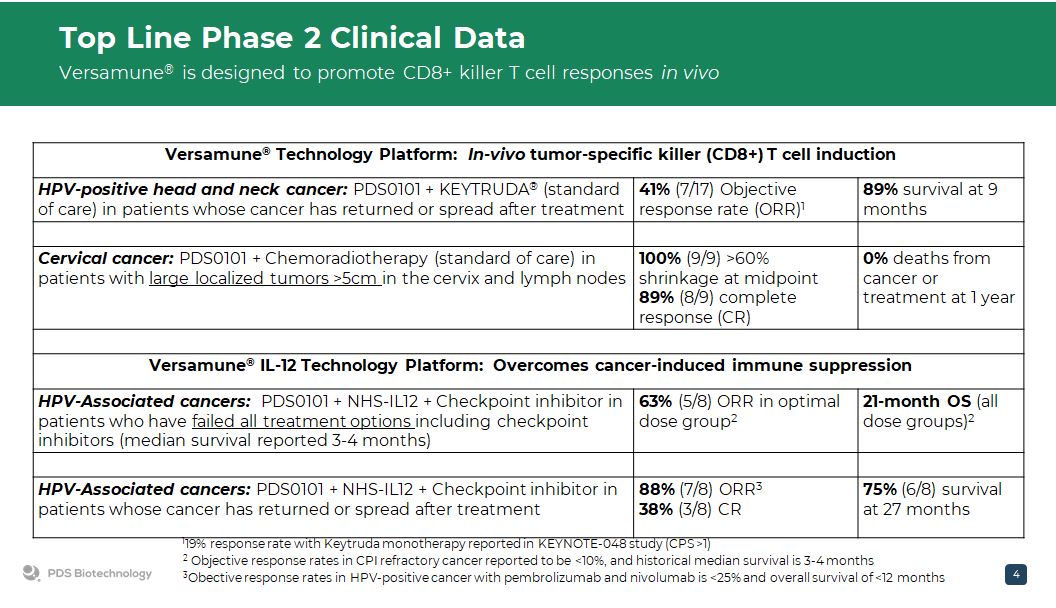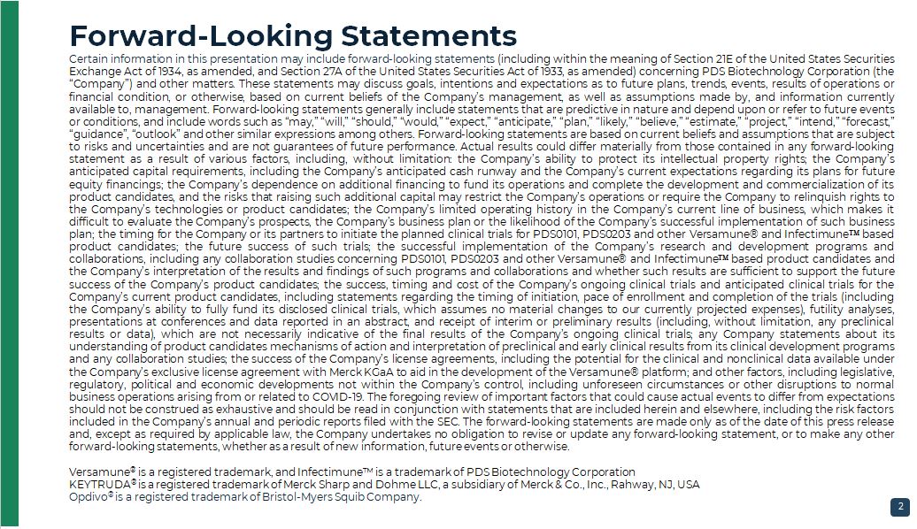 2  Certain information in this presentation may include forward-looking statements (including within the meaning of Section 21E of the United States Securities Exchange Act of 1934, as amended, and Section 27A of the United States Securities Act of 1933, as amended) concerning PDS Biotechnology Corporation (the “Company”) and other matters. These statements may discuss goals, intentions and expectations as to future plans, trends, events, results of operations or financial condition, or otherwise, based on current beliefs of the Company’s management, as well as assumptions made by, and information currently available to, management. Forward-looking statements generally include statements that are predictive in nature and depend upon or refer to future events or conditions, and include words such as “may,” “will,” “should,” “would,” “expect,” “anticipate,” “plan,” “likely,” “believe,” “estimate,” “project,” “intend,” “forecast,” “guidance”, “outlook” and other similar expressions among others. Forward-looking statements are based on current beliefs and assumptions that are subject to risks and uncertainties and are not guarantees of future performance. Actual results could differ materially from those contained in any forward-looking statement as a result of various factors, including, without limitation: the Company’s ability to protect its intellectual property rights; the Company’s anticipated capital requirements, including the Company’s anticipated cash runway and the Company’s current expectations regarding its plans for future equity financings; the Company’s dependence on additional financing to fund its operations and complete the development and commercialization of its product candidates, and the risks that raising such additional capital may restrict the Company’s operations or require the Company to relinquish rights to the Company’s technologies or product candidates; the Company’s limited operating history in the Company’s current line of business, which makes it difficult to evaluate the Company’s prospects, the Company’s business plan or the likelihood of the Company’s successful implementation of such business plan; the timing for the Company or its partners to initiate the planned clinical trials for PDS0101, PDS0203 and other Versamune® and Infectimune™ based product candidates; the future success of such trials; the successful implementation of the Company’s research and development programs and collaborations, including any collaboration studies concerning PDS0101, PDS0203 and other Versamune® and Infectimune™ based product candidates and the Company’s interpretation of the results and findings of such programs and collaborations and whether such results are sufficient to support the future success of the Company’s product candidates; the success, timing and cost of the Company’s ongoing clinical trials and anticipated clinical trials for the Company’s current product candidates, including statements regarding the timing of initiation, pace of enrollment and completion of the trials (including the Company’s ability to fully fund its disclosed clinical trials, which assumes no material changes to our currently projected expenses), futility analyses, presentations at conferences and data reported in an abstract, and receipt of interim or preliminary results (including, without limitation, any preclinical results or data), which are not necessarily indicative of the final results of the Company’s ongoing clinical trials; any Company statements about its understanding of product candidates mechanisms of action and interpretation of preclinical and early clinical results from its clinical development programs and any collaboration studies; the success of the Company’s license agreements, including the potential for the clinical and nonclinical data available under the Company’s exclusive license agreement with Merck KGaA to aid in the development of the Versamune® platform; and other factors, including legislative, regulatory, political and economic developments not within the Company’s control, including unforeseen circumstances or other disruptions to normal business operations arising from or related to COVID-19. The foregoing review of important factors that could cause actual events to differ from expectations should not be construed as exhaustive and should be read in conjunction with statements that are included herein and elsewhere, including the risk factors included in the Company’s annual and periodic reports filed with the SEC. The forward-looking statements are made only as of the date of this press release and, except as required by applicable law, the Company undertakes no obligation to revise or update any forward-looking statement, or to make any other forward-looking statements, whether as a result of new information, future events or otherwise.  Versamune® is a registered trademark, and Infectimune™ is a trademark of PDS Biotechnology Corporation  KEYTRUDA® is a registered trademark of Merck Sharp and Dohme LLC, a subsidiary of Merck & Co., Inc., Rahway, NJ, USA  Opdivo® is a registered trademark of Bristol-Myers Squib Company.   Forward-Looking Statements  2