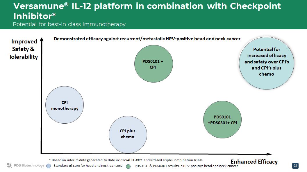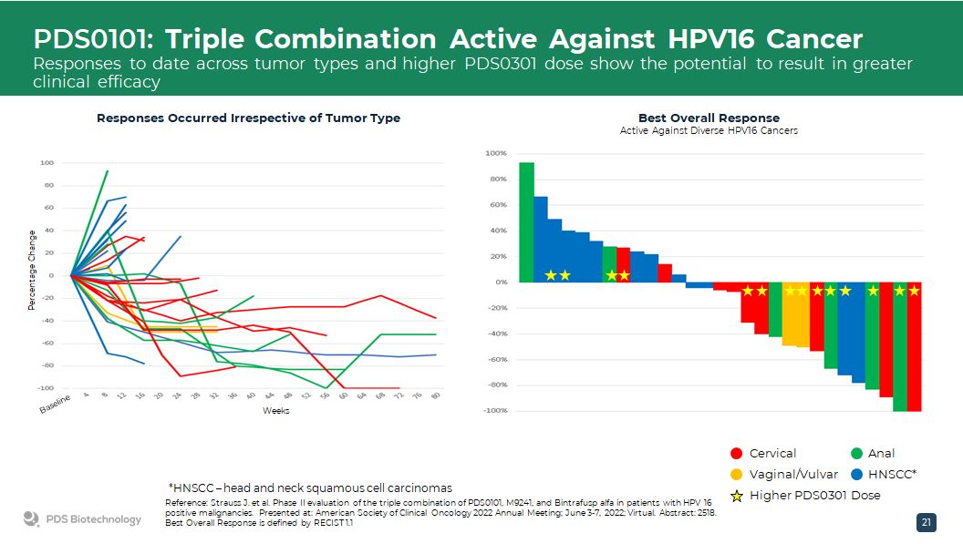 Best Overall Response  Active Against Diverse HPV16 Cancers   PDS0101: Triple Combination Active Against HPV16 Cancer  Responses to date across tumor types and higher PDS0301 dose show the potential to result in greater clinical efficacy  21  *HNSCC – head and neck squamous cell carcinomas  Higher PDS0301 Dose  Cervical  Vaginal/Vulvar  Anal  HNSCC*  Percentage Change  Weeks  Baseline  Responses Occurred Irrespective of Tumor Type  Reference: Strauss J. et al. Phase II evaluation of the triple combination of PDS0101, M9241, and Bintrafusp alfa in patients with HPV 16 positive malignancies. Presented at: American Society of Clinical Oncology 2022 Annual Meeting; June 3-7, 2022; Virtual. Abstract: 2518.   Best Overall Response is defined by RECIST 1.1