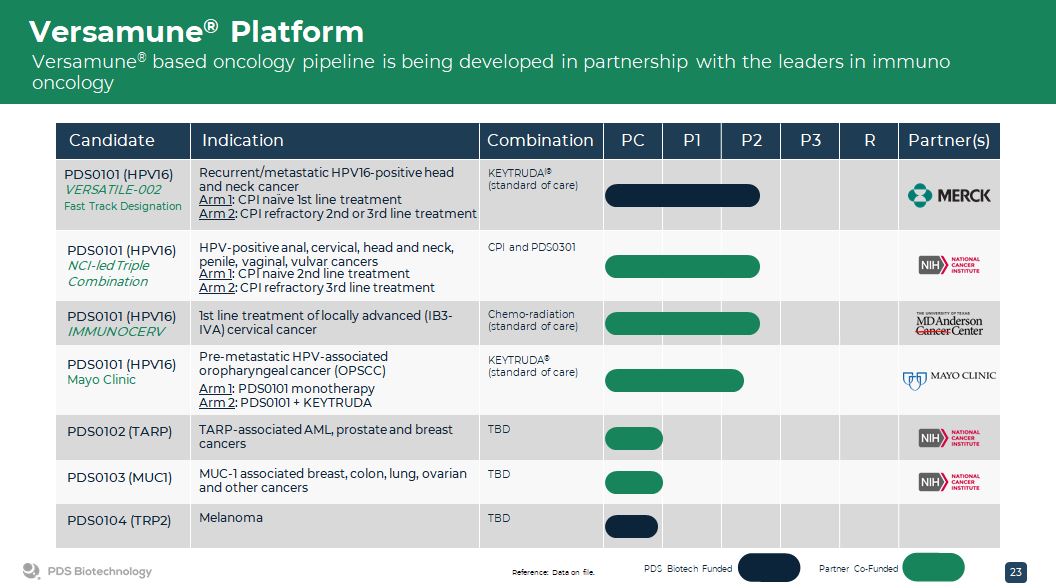 Combination  PDS Biotech Funded  Partner Co-Funded  Versamune® Platform  Versamune® based oncology pipeline is being developed in partnership with the leaders in immuno oncology  PDS0104 (TRP2)  TBD  Arm 1: CPI naïve 1st line treatment  Arm 2: CPI refractory 2nd or 3rd line treatment  PDS0101 (HPV16) VERSATILE-002  Fast Track Designation  PDS0101 (HPV16) IMMUNOCERV  PDS0102 (TARP)  PDS0103 (MUC1)  Candidate  Indication  PC  P1  P2  P3  R  Partner(s)  Recurrent/metastatic HPV16-positive head and neck cancer  KEYTRUDA(®  (standard of care)  HPV-positive anal, cervical, head and neck, penile, vaginal, vulvar cancers  Arm 1: CPI naive 2nd line treatment  Arm 2: CPI refractory 3rd line treatment  CPI and PDS0301  1st line treatment of locally advanced (IB3-IVA) cervical cancer  TARP-associated AML, prostate and breast cancers  MUC-1 associated breast, colon, lung, ovarian and other cancers  Chemo-radiation (standard of care)  TBD  TBD  Reference: Data on file.  23  PDS0101 (HPV16)  Mayo Clinic  Pre-metastatic HPV-associated oropharyngeal cancer (OPSCC)  Arm 1: PDS0101 monotherapy  Arm 2: PDS0101 + KEYTRUDA  KEYTRUDA®   (standard of care)  PDS0101 (HPV16) NCI-led Triple Combination  Melanoma