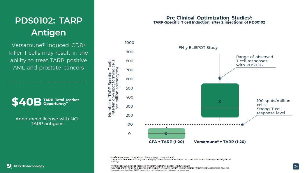 CFA + TARP (1-20)  X  PDS0102: TARP Antigen   Versamune® induced CD8+ killer T cells may result in the ability to treat TARP positive AML and prostate cancers  Pre-Clinical Optimization Studies1:   TARP-Specific T cell Induction after 2 injections of PDS0102  1 Reference: Wood LV et al, Oncoimmunology, 2016, Vol. 5 (8)  CFA –Complete Freund’s Adjuvant a highly potent immune activator not used in humans due to potentially lethal toxicity   *Reference: Surveillance Research Program, National Cancer Institute SEER  Assumes $150K for annual course of therapy; in line with current immunotherapy treatment.Assessments have not been adjusted to reflect TARP expression, which is currently unknown by tumor type  $40B   TARP Total Market Opportunity*  Announced license with NCI TARP antigens  Number of TARP-Specific T cells  (Interfer on-y spot forming cells   per million splenocytes)  0  100  200  300  400  500  600  700  800  900  1000  100 spots/million cells   Strong T cell response level  Range of observed T cell responses with PDS0102  IFN-y ELISPOT Study  Versamune® + TARP (1-20)  X  3  24