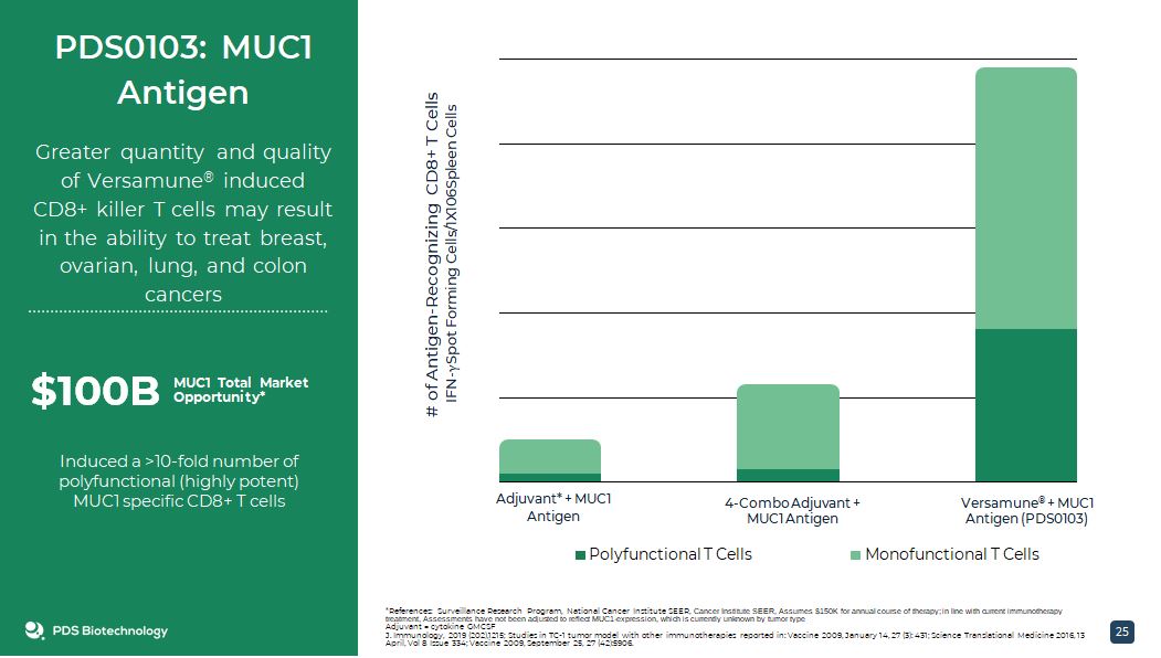 Induced a >10-fold number of polyfunctional (highly potent) MUC1 specific CD8+ T cells  PDS0103: MUC1 Antigen  Greater quantity and quality of Versamune® induced CD8+ killer T cells may result in the ability to treat breast, ovarian, lung, and colon cancers  *References: Surveillance Research Program, National Cancer Institute SEER, Cancer Institute SEER, Assumes $150K for annual course of therapy; in line with current immunotherapy treatment, Assessments have not been adjusted to reflect MUC1-expression, which is currently unknown by tumor type  Adjuvant = cytokine GMCSF  J. Immunology, 2019 (202),1215; Studies in TC-1 tumor model with other immunotherapies reported in: Vaccine 2009, January 14, 27 (3): 431; Science Translational Medicine 2016, 13 April, Vol 8 Issue 334; Vaccine 2009, September 25, 27 (42):5906.  IFN-γSpot Forming Cells/1X106Spleen Cells  Polyfunctional T Cells  Monofunctional T Cells  4-Combo Adjuvant + MUC1 Antigen  Versamune® + MUC1 Antigen (PDS0103)  # of Antigen-Recognizing CD8+ T Cells  $100B   MUC1 Total Market Opportunity*  Adjuvant* + MUC1 Antigen  25