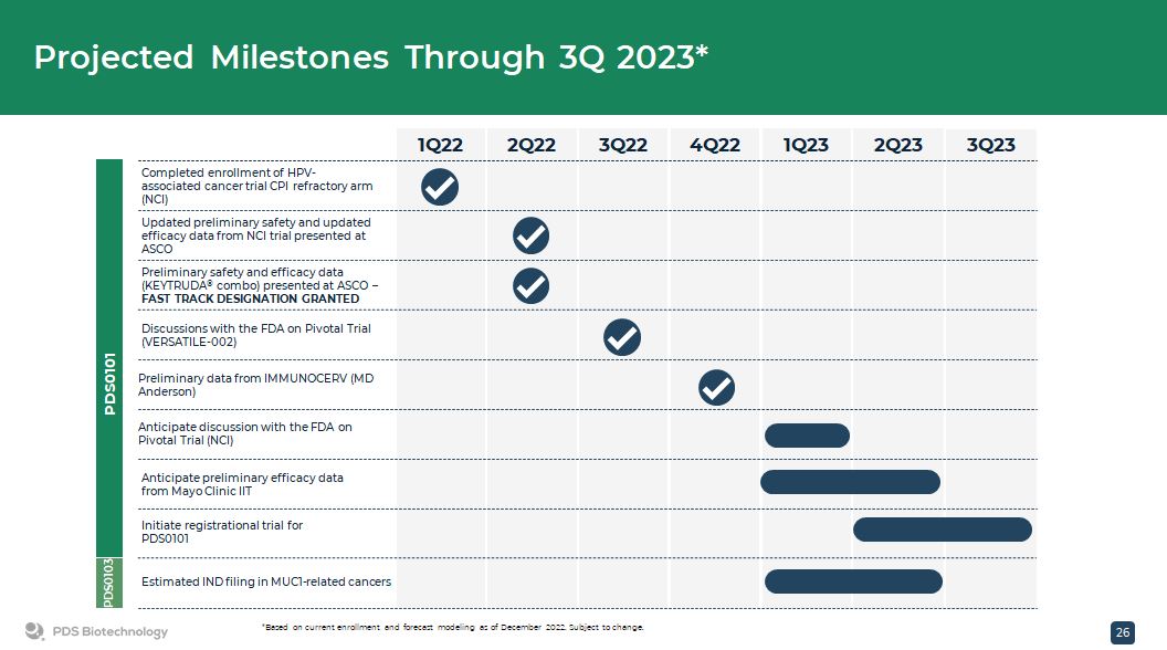 Projected Milestones Through 3Q 2023*  *Based on current enrollment and forecast modeling as of December 2022. Subject to change.  26  1Q22  2Q22  3Q22  4Q22  1Q23  2Q23  PDS0101  Completed enrollment of HPV-  associated cancer trial CPI refractory arm (NCI)  Preliminary data from IMMUNOCERV (MD Anderson)  Estimated IND filing in MUC1-related cancers  PDS0103  Anticipate preliminary efficacy data from Mayo Clinic IIT   3Q23  Updated preliminary safety and updated efficacy data from NCI trial presented at ASCO  Preliminary safety and efficacy data (KEYTRUDA® combo) presented at ASCO – FAST TRACK DESIGNATION GRANTED  Anticipate discussion with the FDA on Pivotal Trial (NCI)  Discussions with the FDA on Pivotal Trial (VERSATILE-002)  Initiate registrational trial for PDS0101