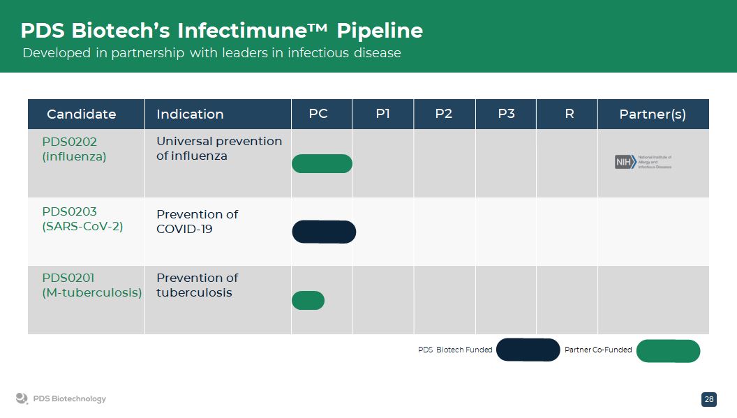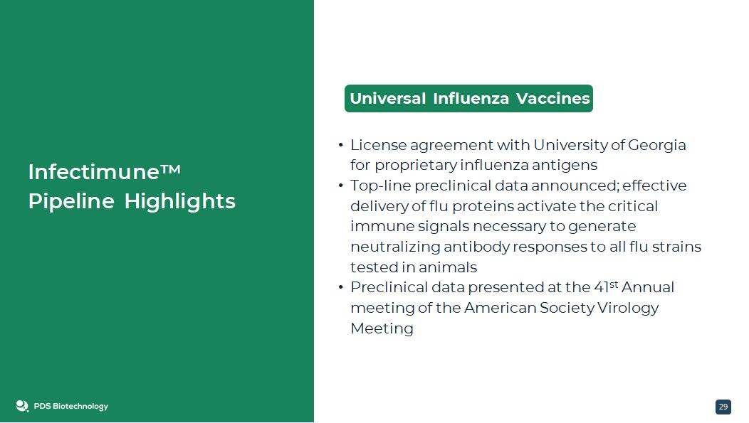 PDS Biotech’s Infectimune™ Pipeline   Developed in partnership with leaders in infectious disease  Prevention of tuberculosis  PDS0201   (M-tuberculosis)  Candidate  Indication  PC  P1  P2  P3  R  Partner(s)  Universal prevention of influenza  PDS Biotech Funded  Partner Co-Funded  PDS0202 (influenza)  PDS0203   (SARS-CoV-2)  Prevention of COVID-19  28